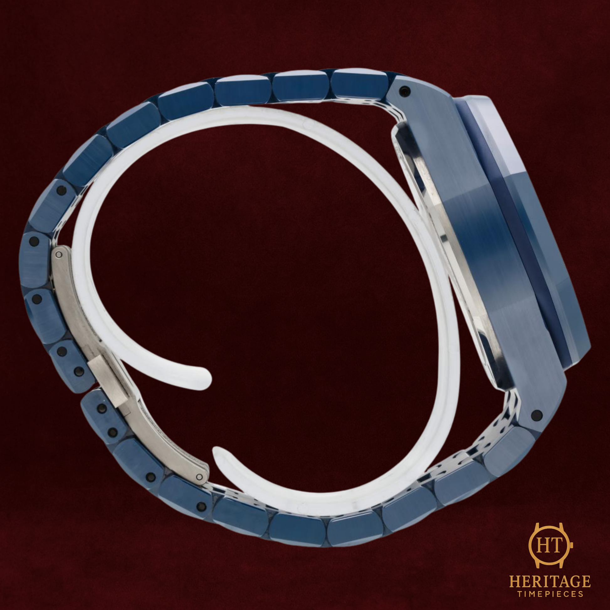 This 2025 example features a striking blue dial paired with a matching ceramic bracelet, creating a monochromatic look that highlights the model’s technical precision and sculptural design. The sapphire crystal front and back reveal meticulously finished components, while the Offshore’s iconic screw-down crown and pushers ensure 100 m water resistance. As a full-set piece in new condition, it embodies the cutting edge of AP’s modern sports-watch engineering.
