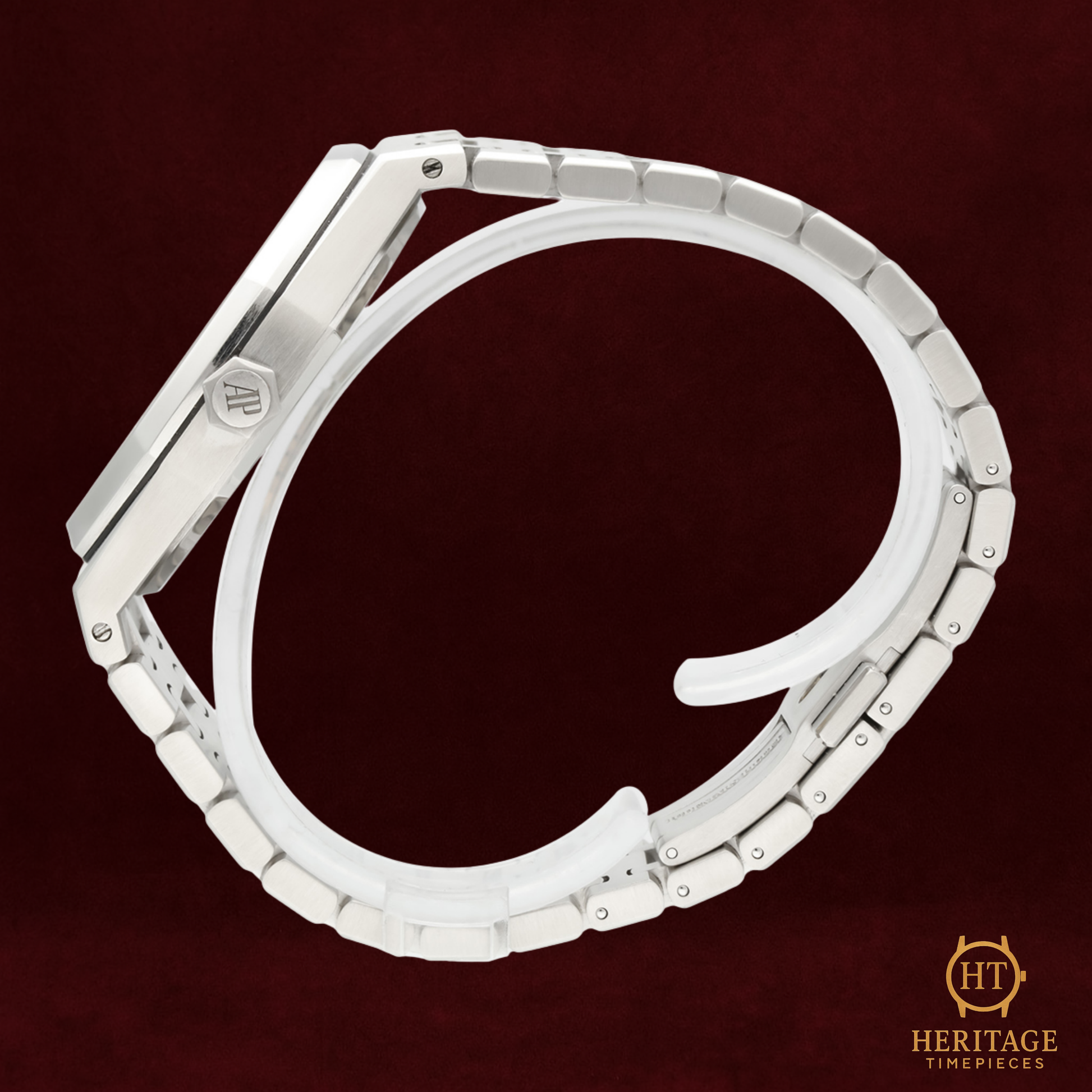 This 2016 example features a white Grande Tapisserie dial, a configuration prized for its clean, architectural symmetry and its ability to highlight the depth of AP’s signature guilloché pattern. The stainless-steel case and integrated bracelet showcase the iconic mix of satin brushing and razor-sharp polished bevels that define the Royal Oak’s distinctive aesthetic. A sapphire caseback reveals the in-house calibre 3120, celebrated for its reliability, finishing, and 22k gold rotor.