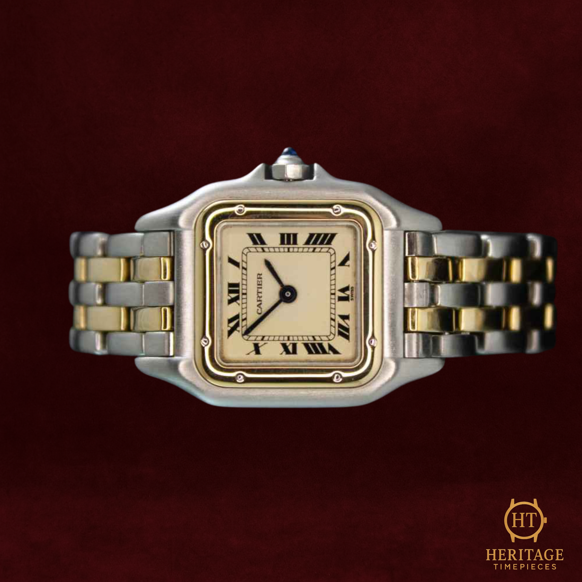 The dial, rendered in Cartier’s signature style with Roman numerals, blued-steel hands, and a cabochon sapphire crown, preserves the maison’s unmistakable identity. Powered by a Swiss quartz movement, this Panthère delivers the reliability and refinement that have made it one of Cartier’s most enduring creations.