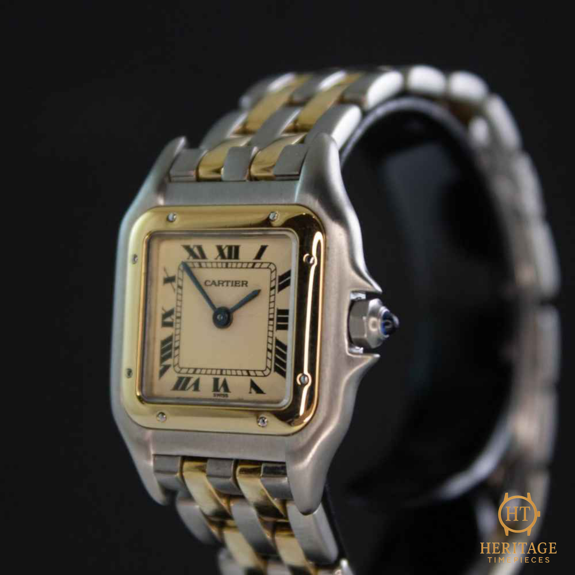Classic Cartier dial with Roman numerals, blued-steel sword hands, and minute track