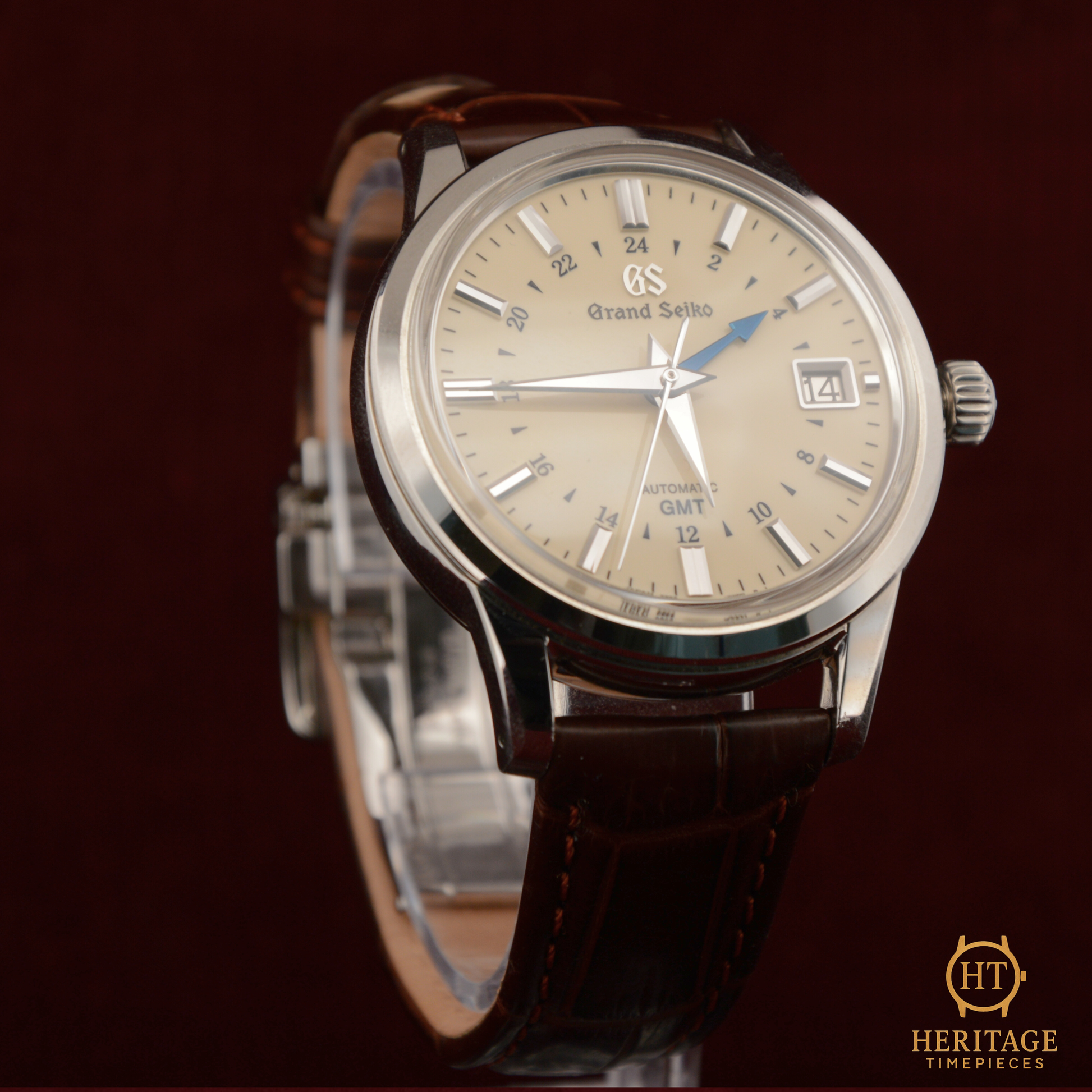 Its 39.5 mm stainless steel case houses the renowned Calibre 9S66, a high-grade automatic GMT movement developed entirely in-house by Grand Seiko. The warm ivory-cream dial, paired with blued GMT hand and multi-faceted indexes, evokes the understated sophistication that defines the brand’s style. Offered in excellent condition with full box and certificate, this SBGM221G stands as one of the most elegant and balanced mechanical GMT watches in modern horology.
