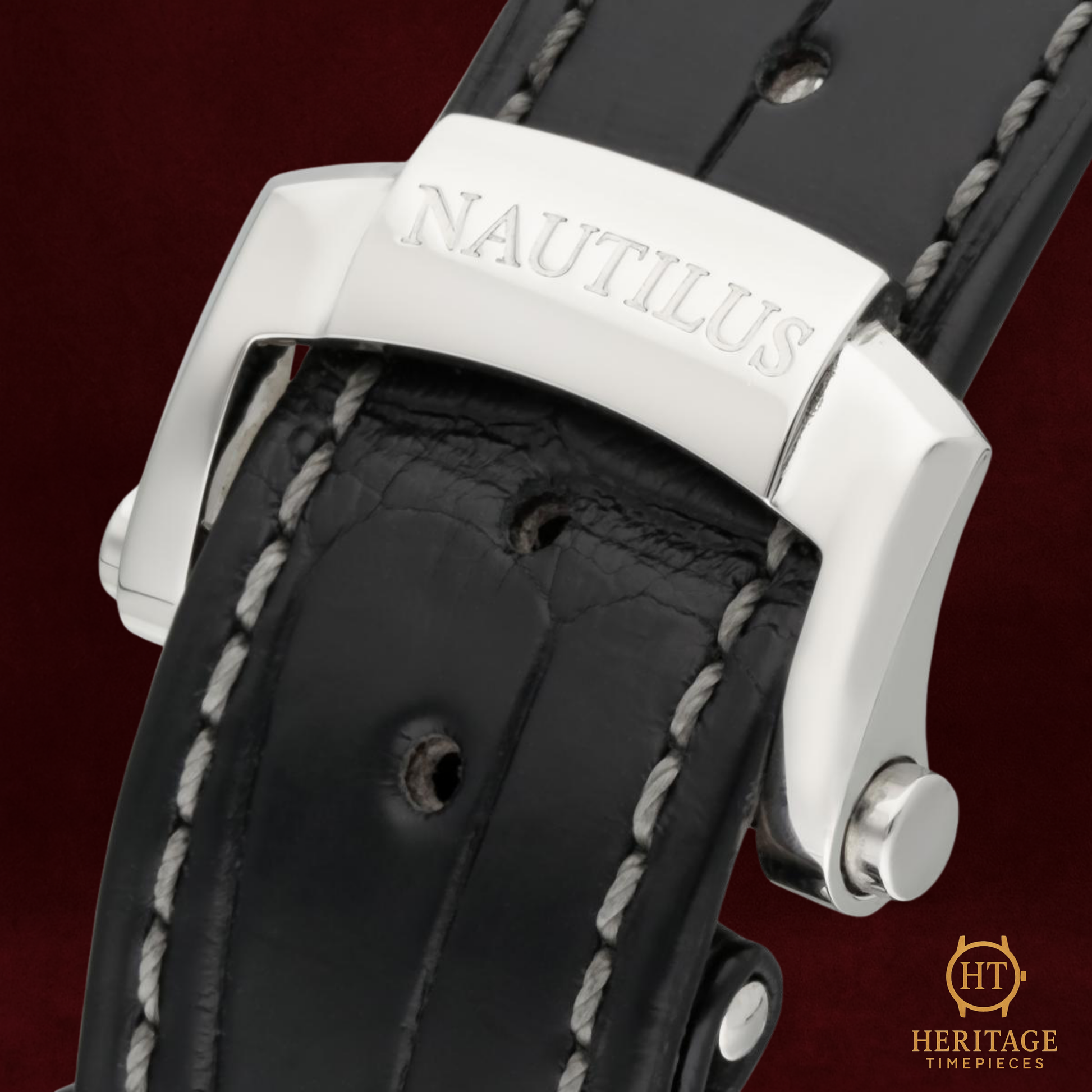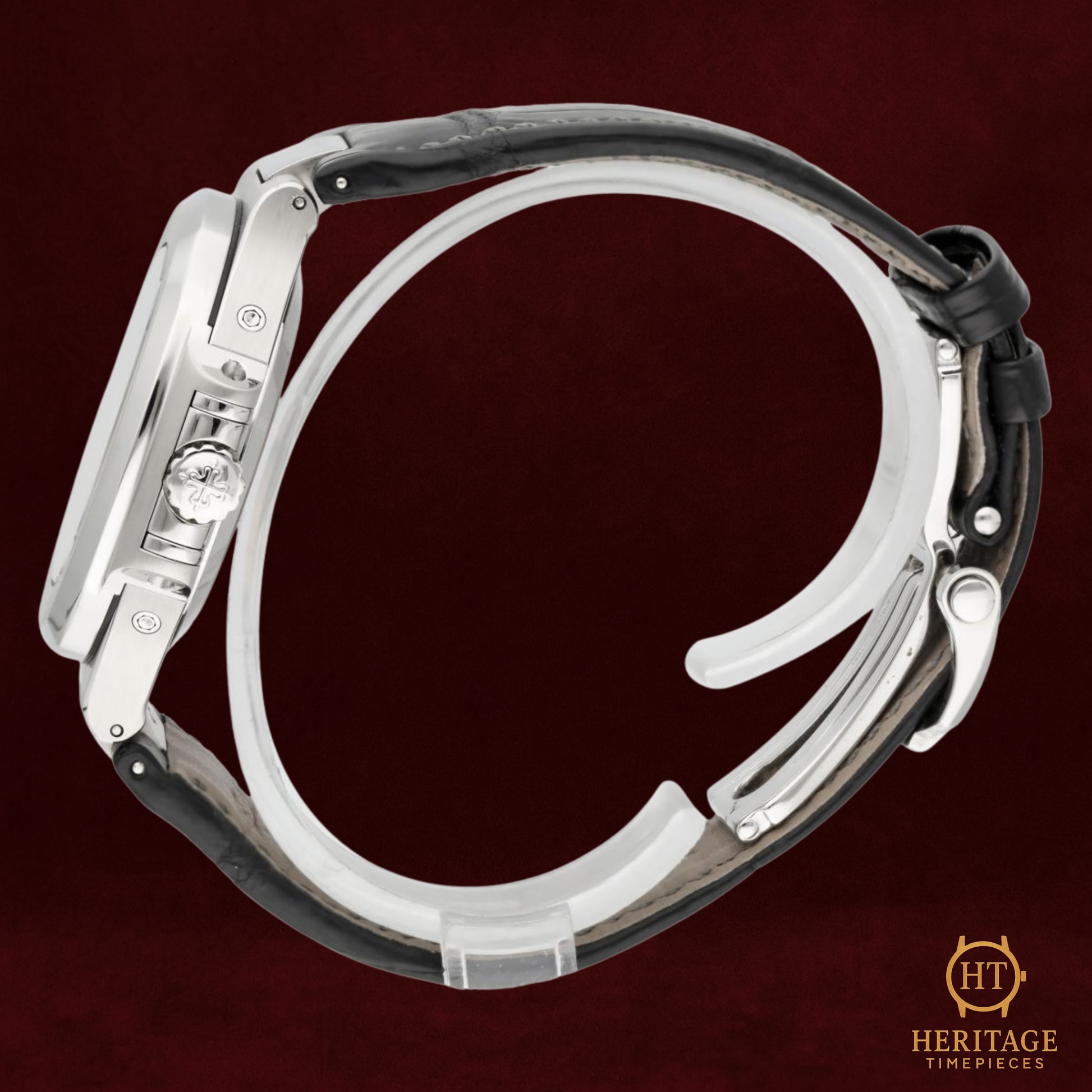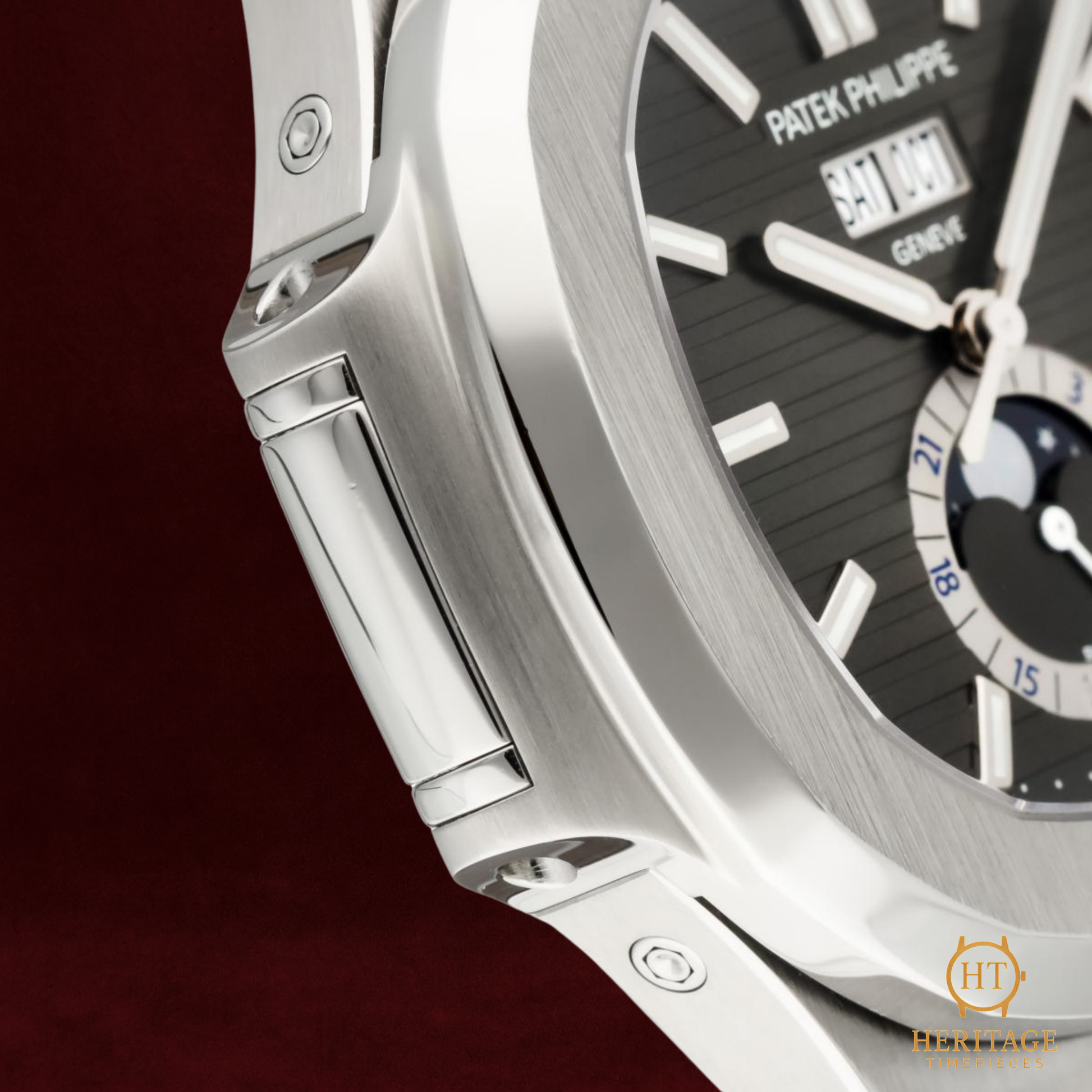 The grey embossed dial carries the trademark horizontal pattern of the Nautilus line, enhanced by luminous indices, a moonphase aperture, and a clean, symmetrical layout that houses the full 12-month calendar with day, date, and month indications. Powered by an automatic movement visible through the sapphire caseback, the 5726A offers technical depth without sacrificing the elegance that defines the Nautilus identity.