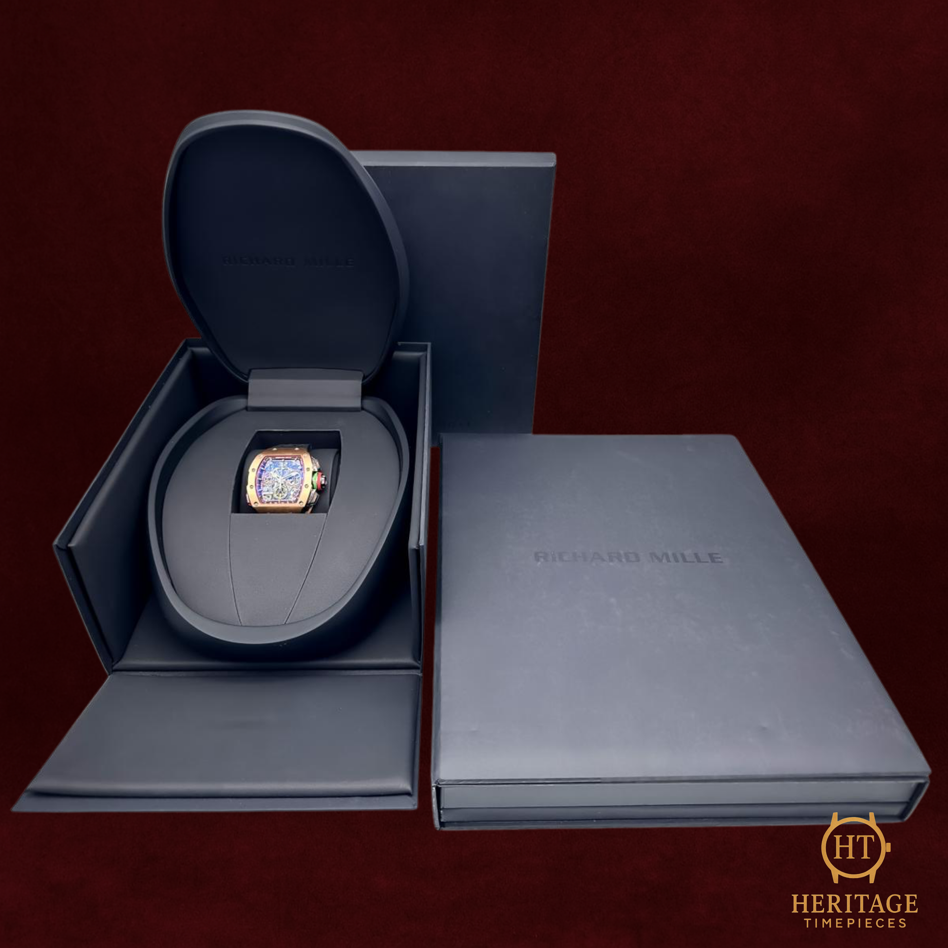 This 2021 example features a complex case construction combining 18k rose gold with titanium, a signature Richard Mille approach that balances luxury with structural integrity and weight reduction. The tonneau-shaped 44 mm case houses a fully skeletonized dial, offering a direct view into the movement’s layered architecture, racing-inspired components, and unmistakable RM aesthetic.