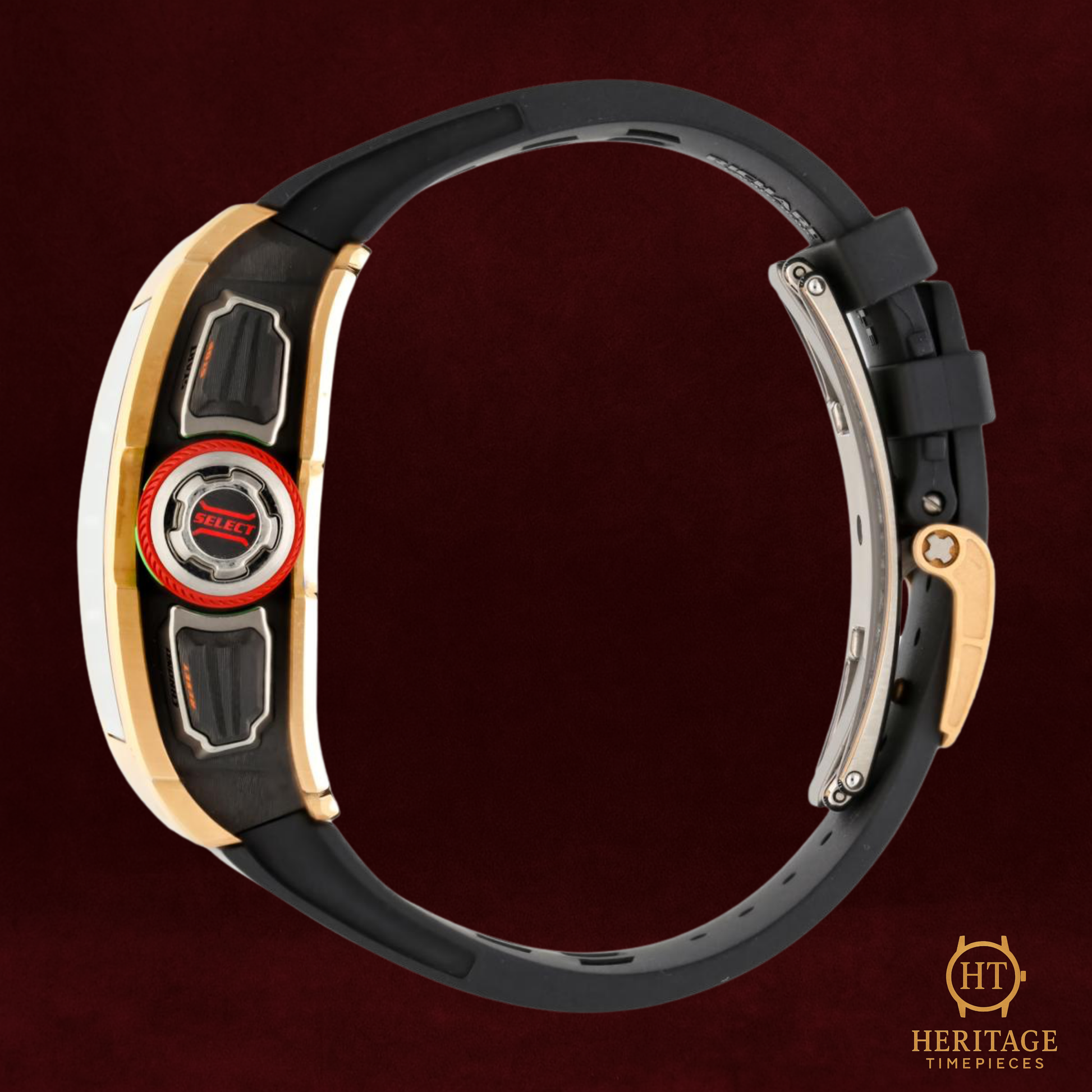 At its core is the RMAC4 automatic split-seconds chronograph movement, operating at 36,000 vibrations per hour and delivering a 60-hour power reserve. Designed from the ground up for durability, it incorporates a rapid winding system and a function selector inspired by automotive gearboxes. The RM65-01 is not a decorative complication; it is a technical instrument expressed through radical design.