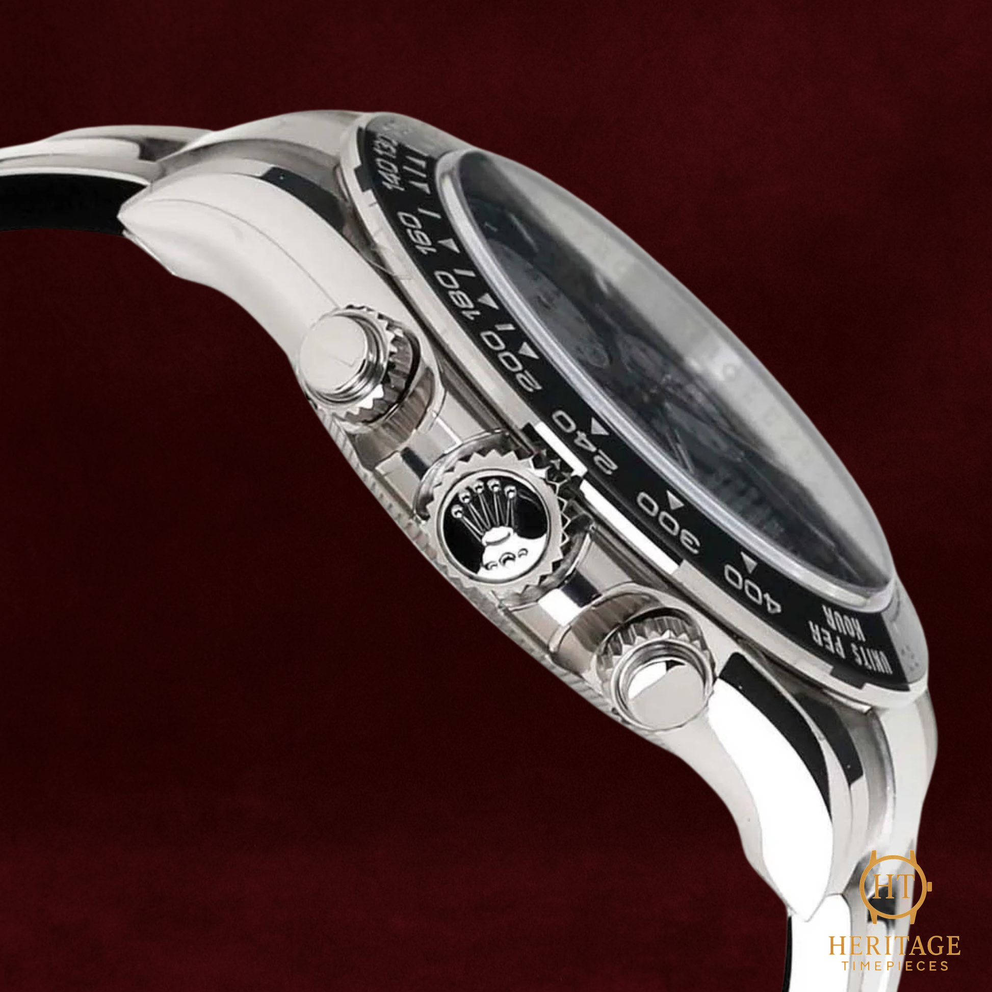 Black Cerachrom ceramic bezel with engraved tachymeter scale filled with platinum PVD numerals