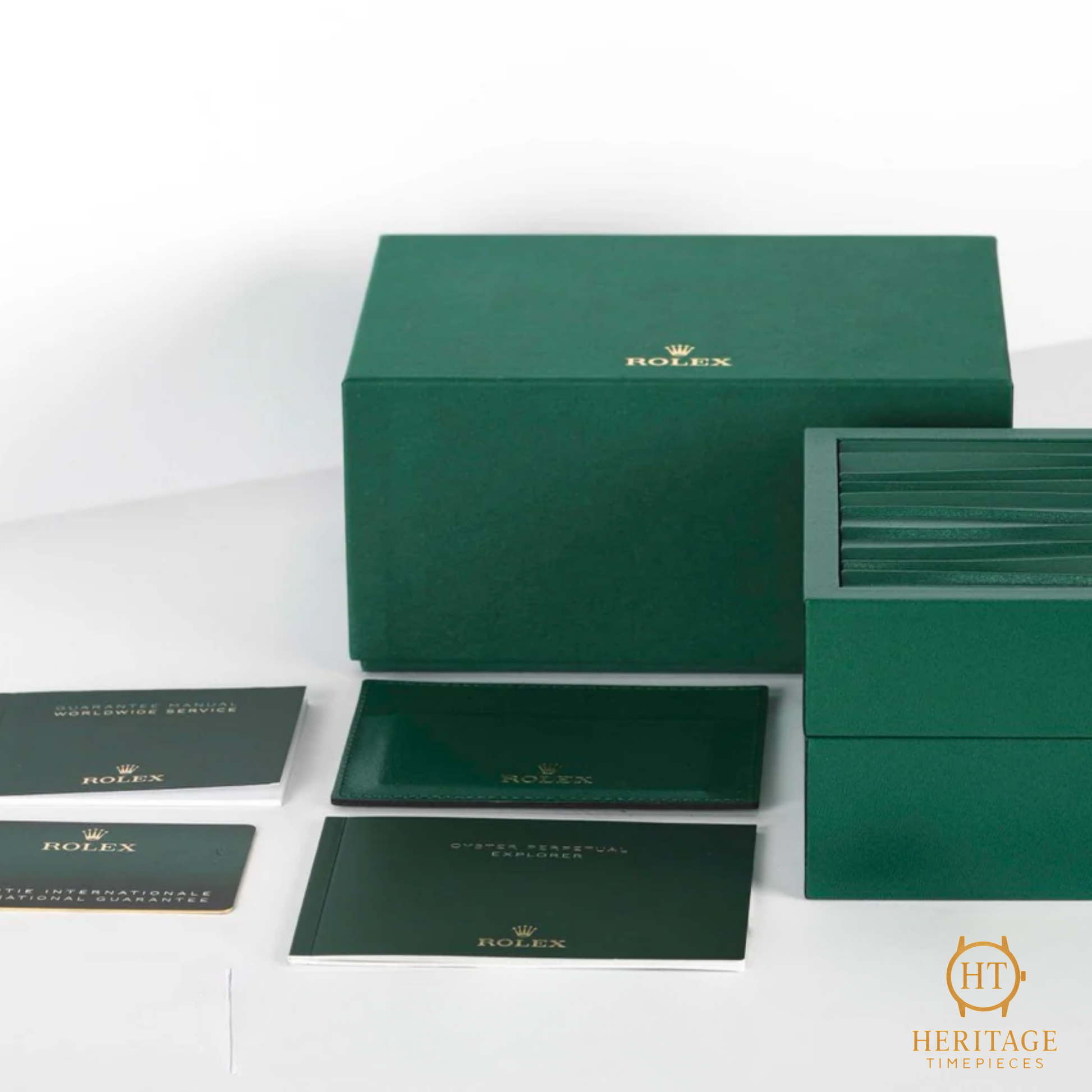 Full set — Rolex presentation box, warranty card, booklets, and tags