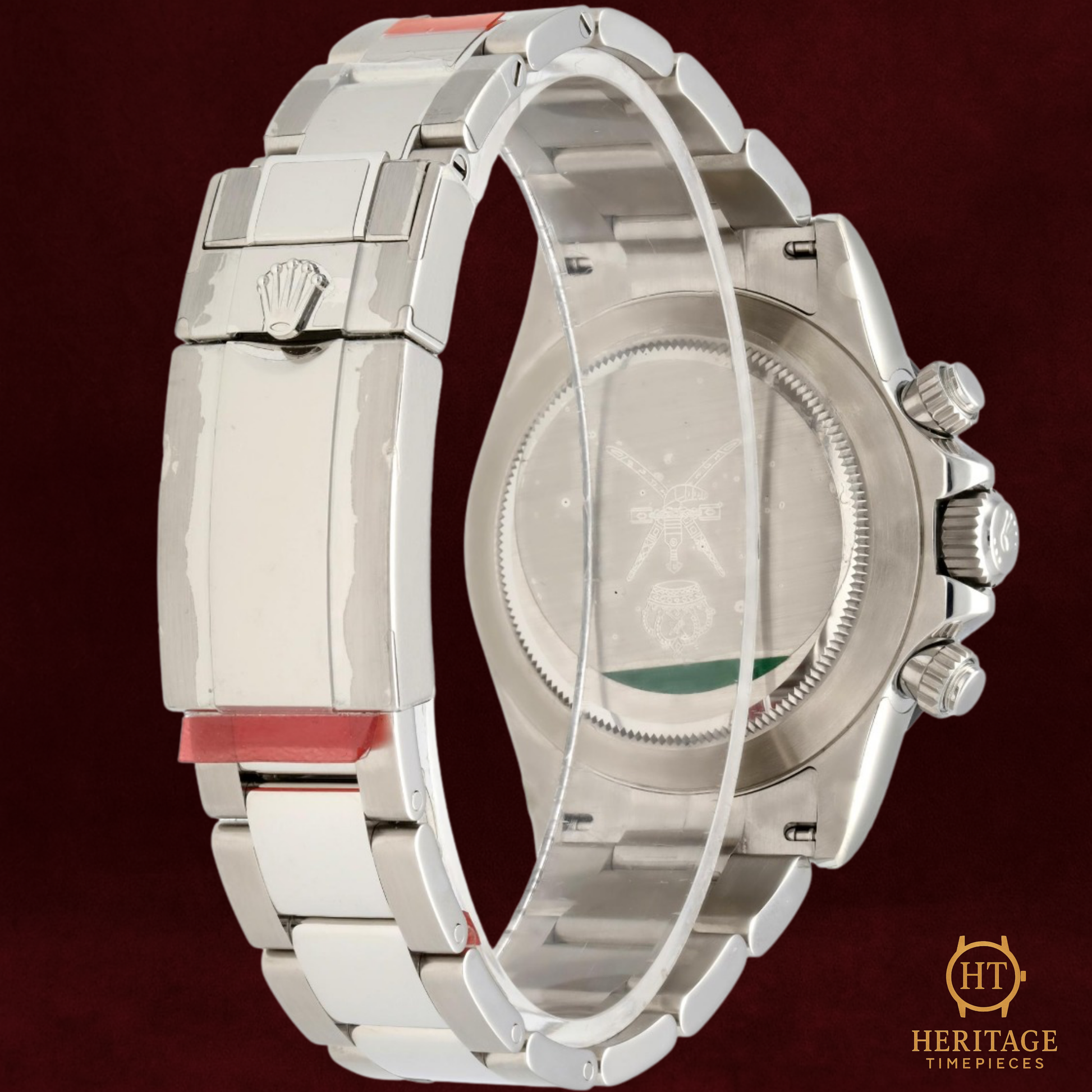 This example is no ordinary 116500LN—it is an extremely rare “Oman Edition”, produced in collaboration with the Sultanate of Oman and issued through the country’s royal retailer, Khimji Ramdas. The black dial bears the distinctive red Khanjar emblem, the national crest of Oman, making it one of the most collectible contemporary Daytonas ever released. Watches bearing this royal insignia were produced in very limited numbers, reserved exclusively for dignitaries and VIPs.