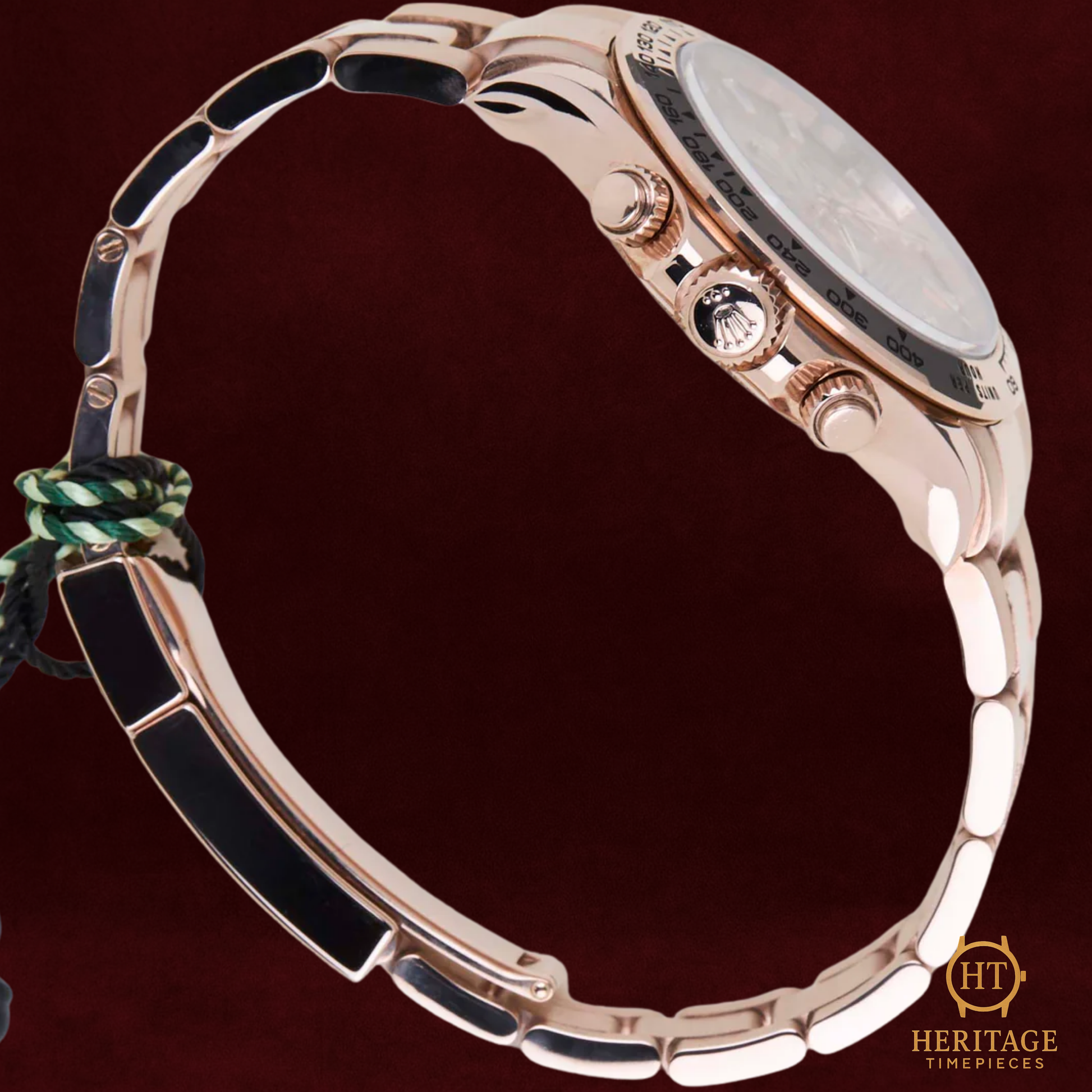 The reference 116505 represents the Everose gold generation of the Daytona, crafted in Rolex’s proprietary 18k rose gold alloy designed to preserve its warm hue over time. This reference balances technical performance with unmistakable presence, offering a distinctly modern interpretation of the Daytona formula.