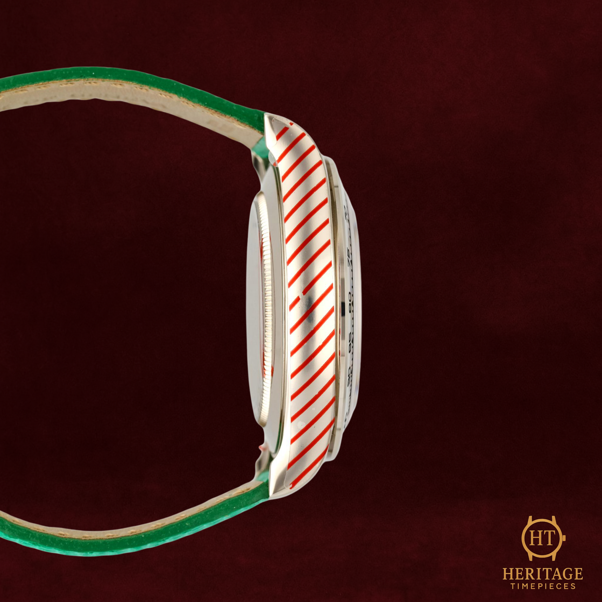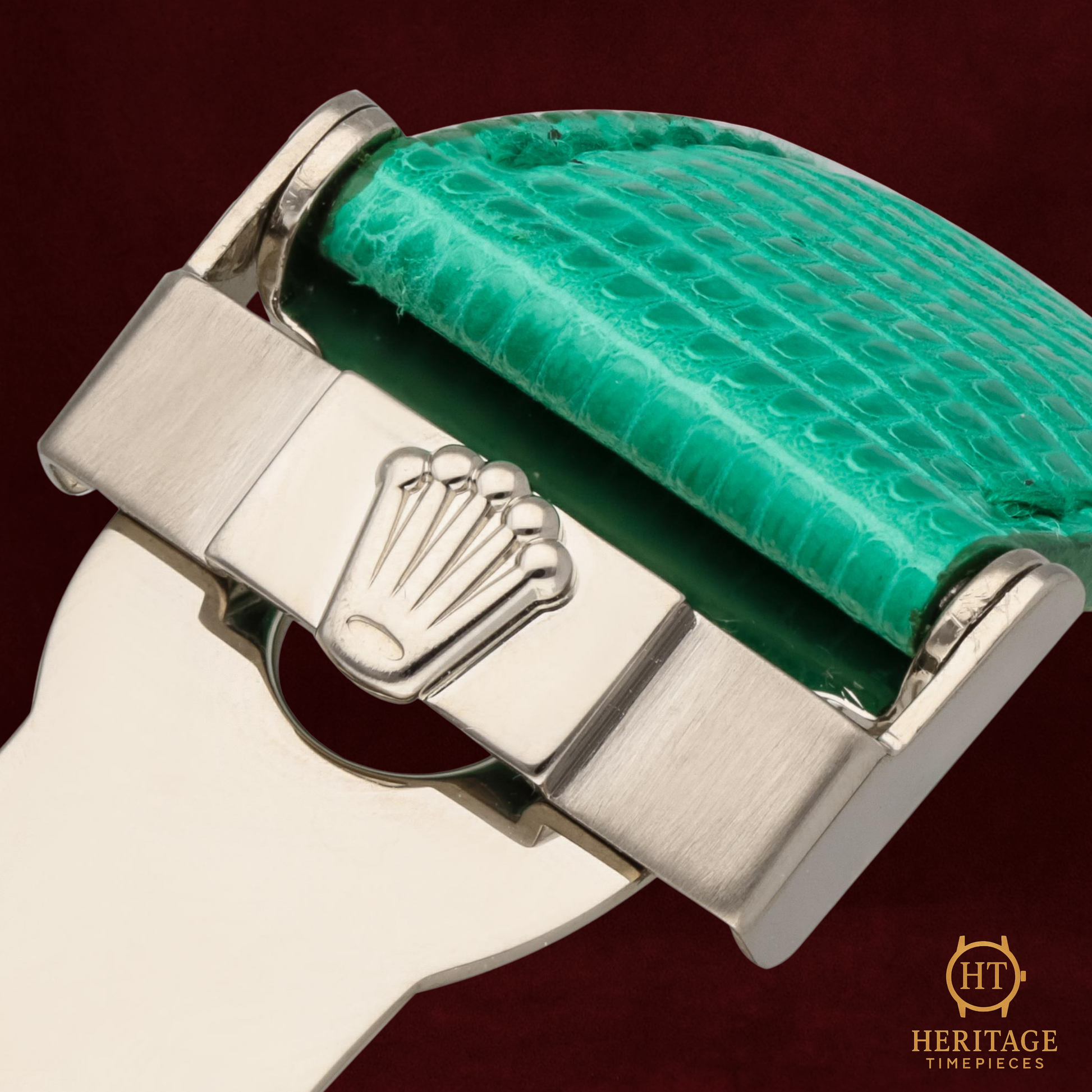 This reference 116519 is the highly sought-after “Beach Green” configuration, executed in 18k white gold and featuring a glossy lacquered green dial with applied Roman numerals. The daring color palette and vivid presentation marked a departure from traditional Daytona aesthetics, making these pieces among the most collectible and distinctive modern iterations ever released.
