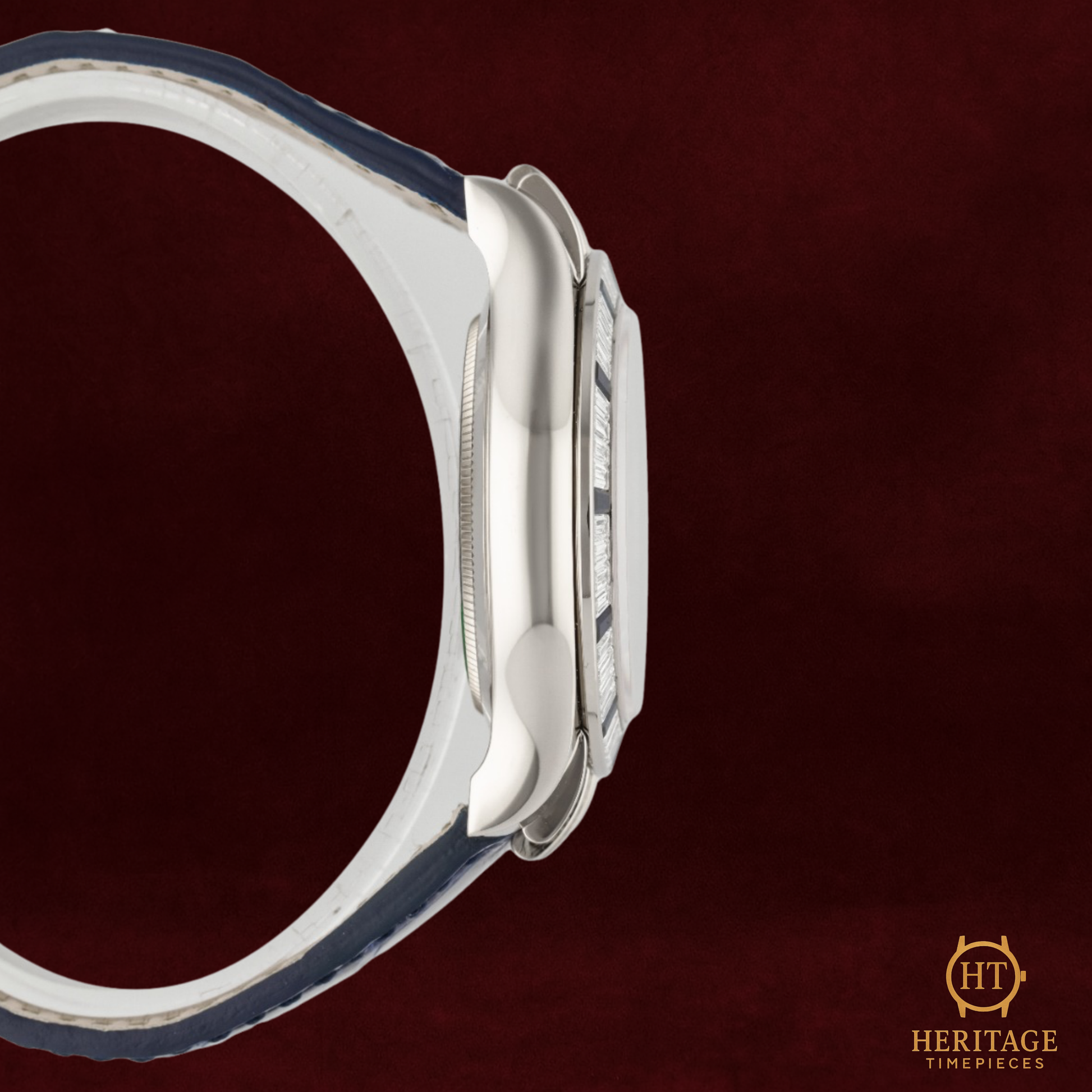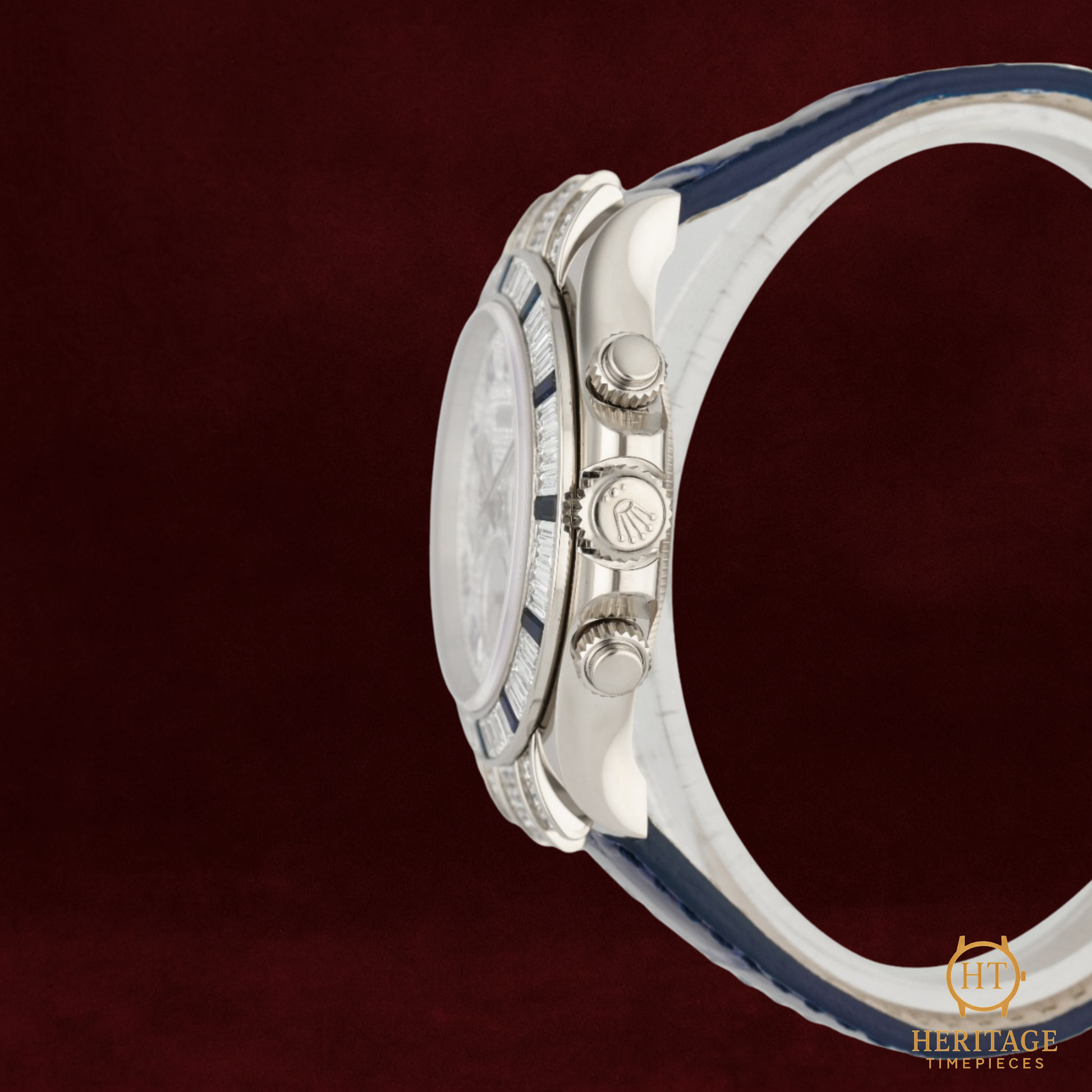 The reference 11659912SA, crafted in 18k white gold, represents one of the most exclusive and lavish executions of the modern Daytona. The bezel is set with 36 baguette-cut blue sapphires, perfectly graduated to form a vivid halo around the dial, while the lugs and crown guards are adorned with factory-set brilliant-cut diamonds. The white dial with Roman numerals provides a classic, elegant contrast to the radiant gemstone setting.