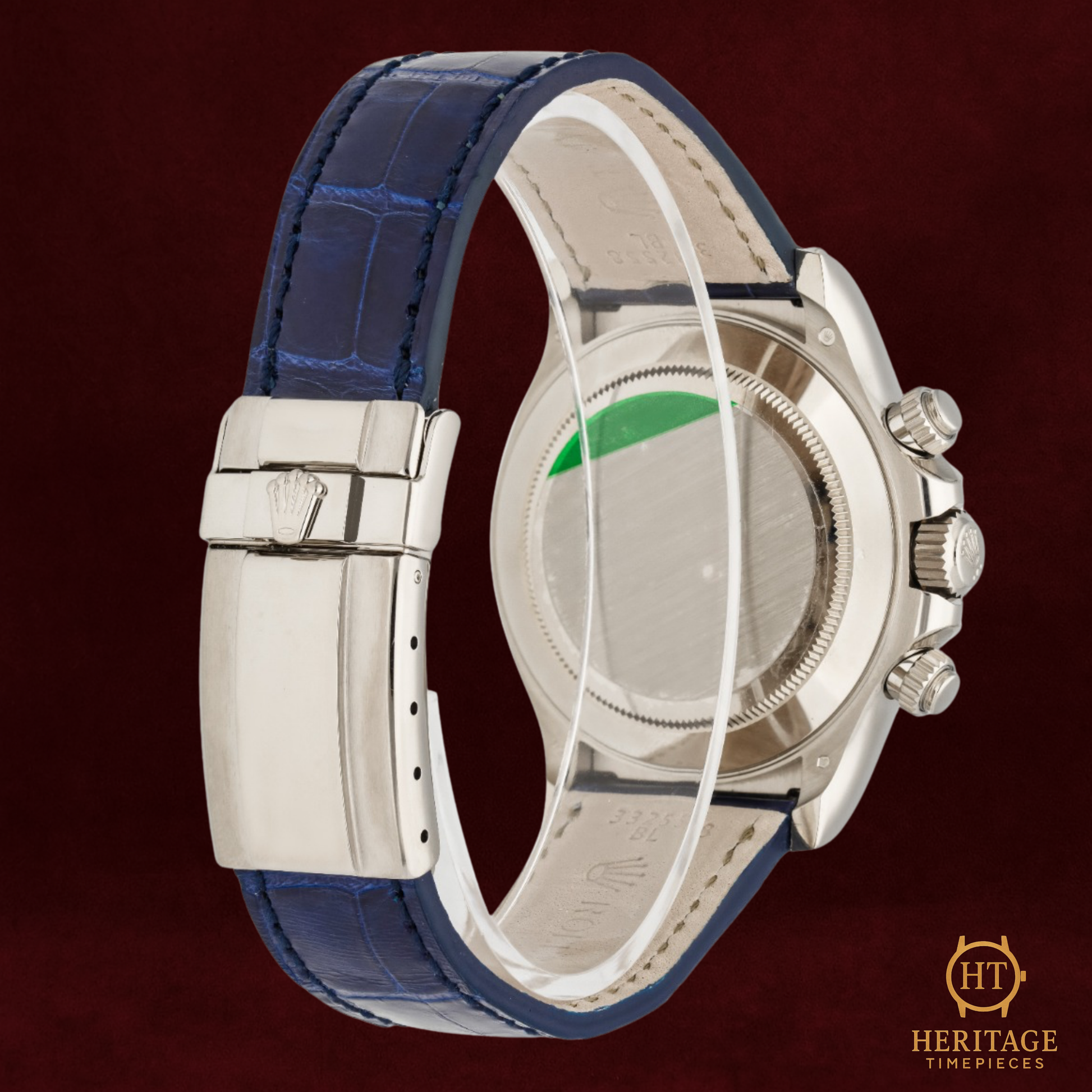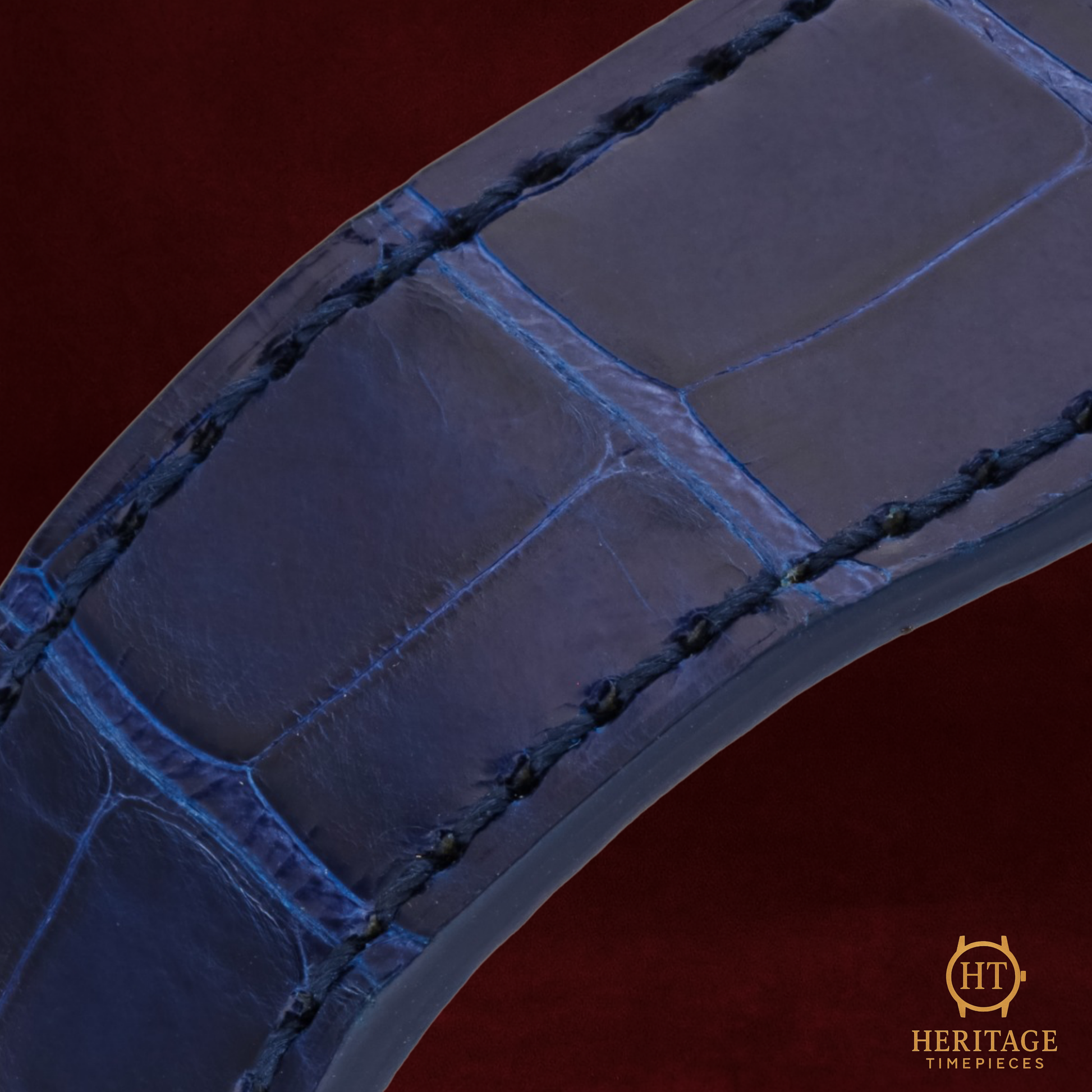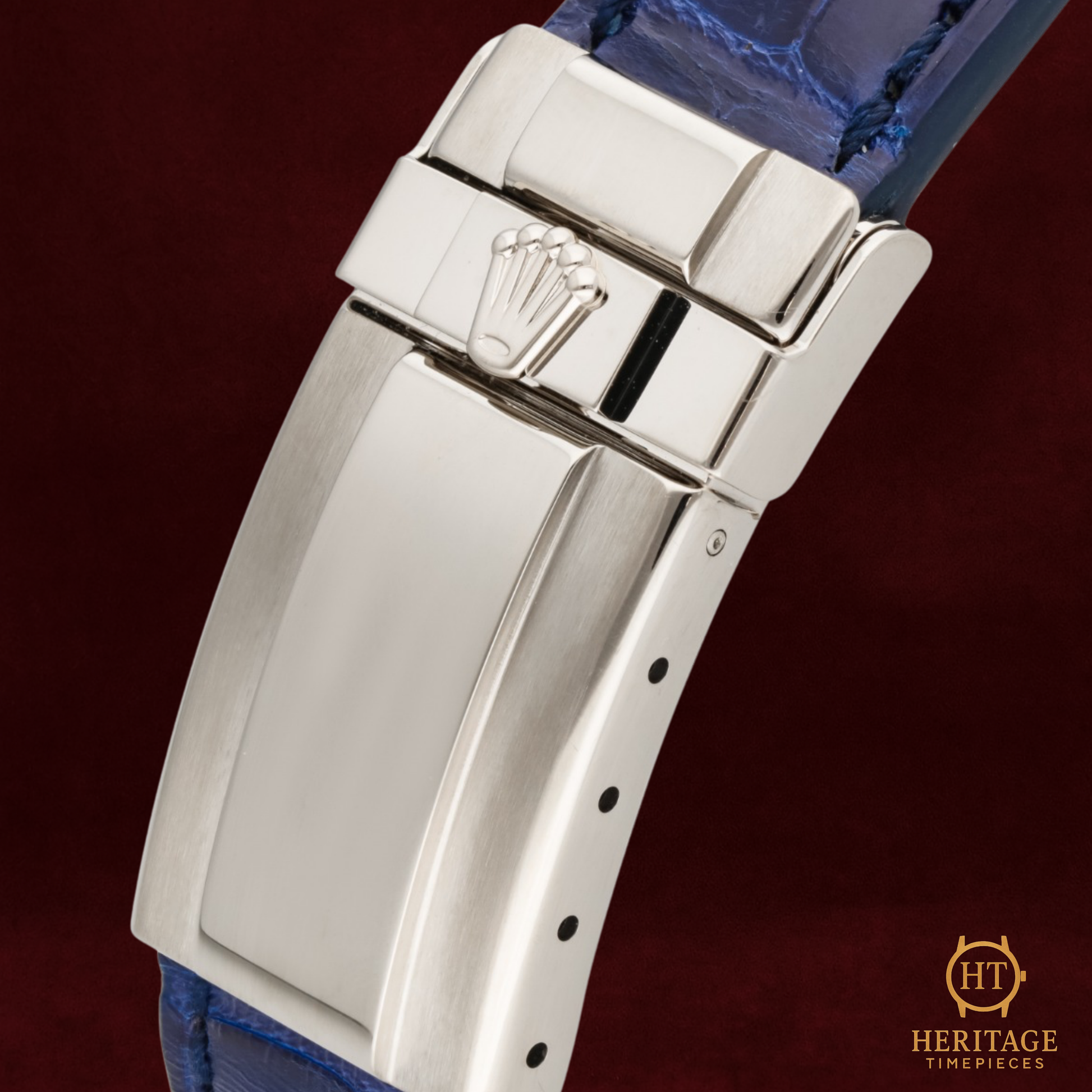 Blue alligator leather strap with 18k white gold deployant clasp