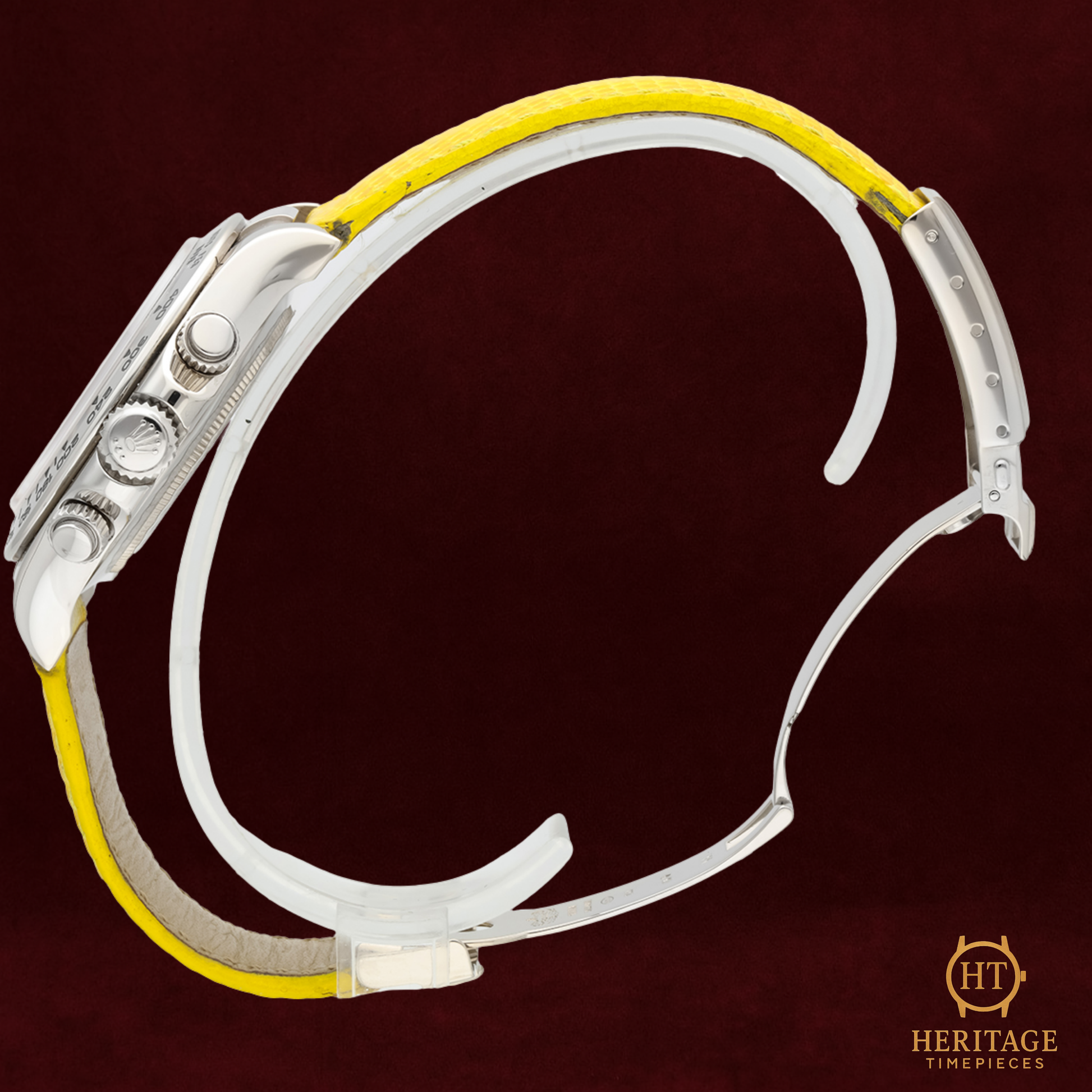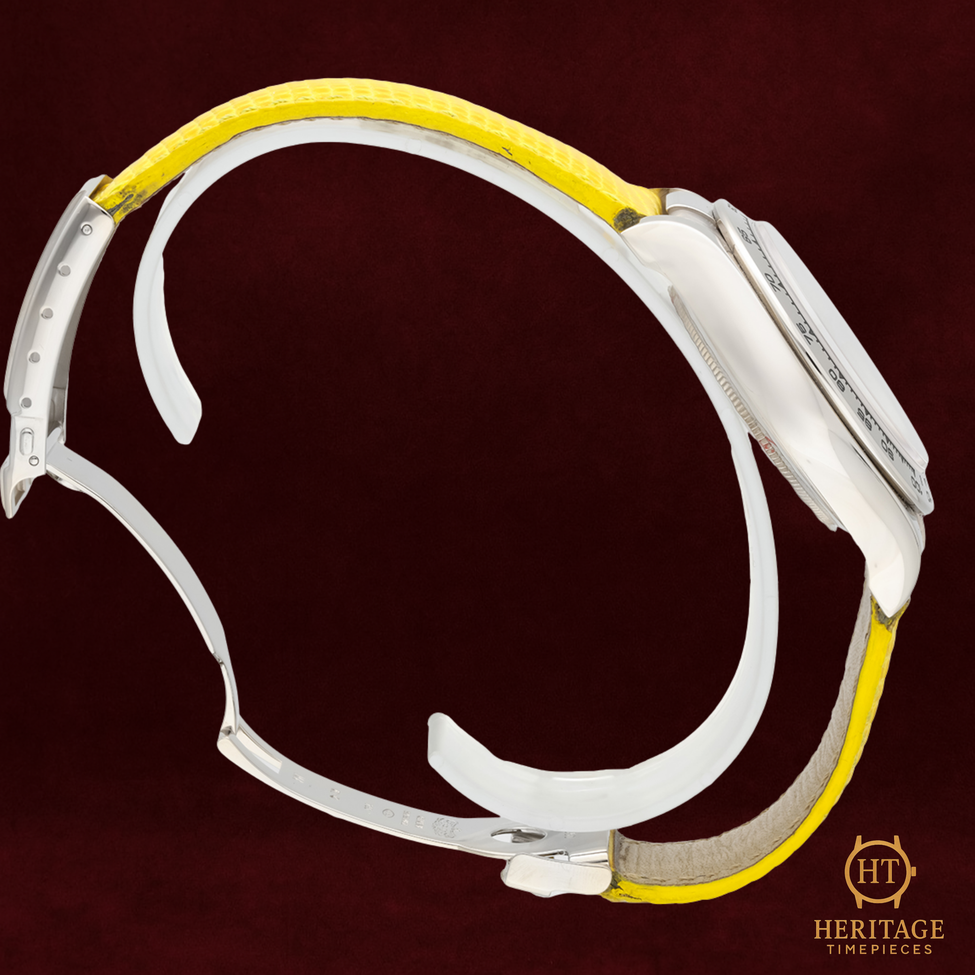 Yellow alligator leather strap with 18k white gold deployant clasp
