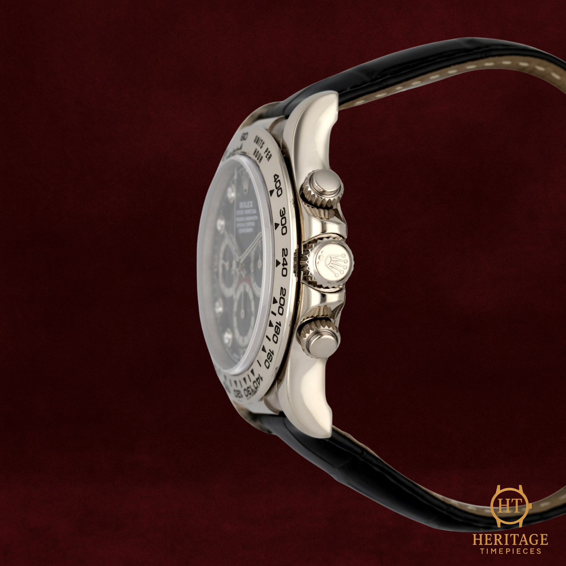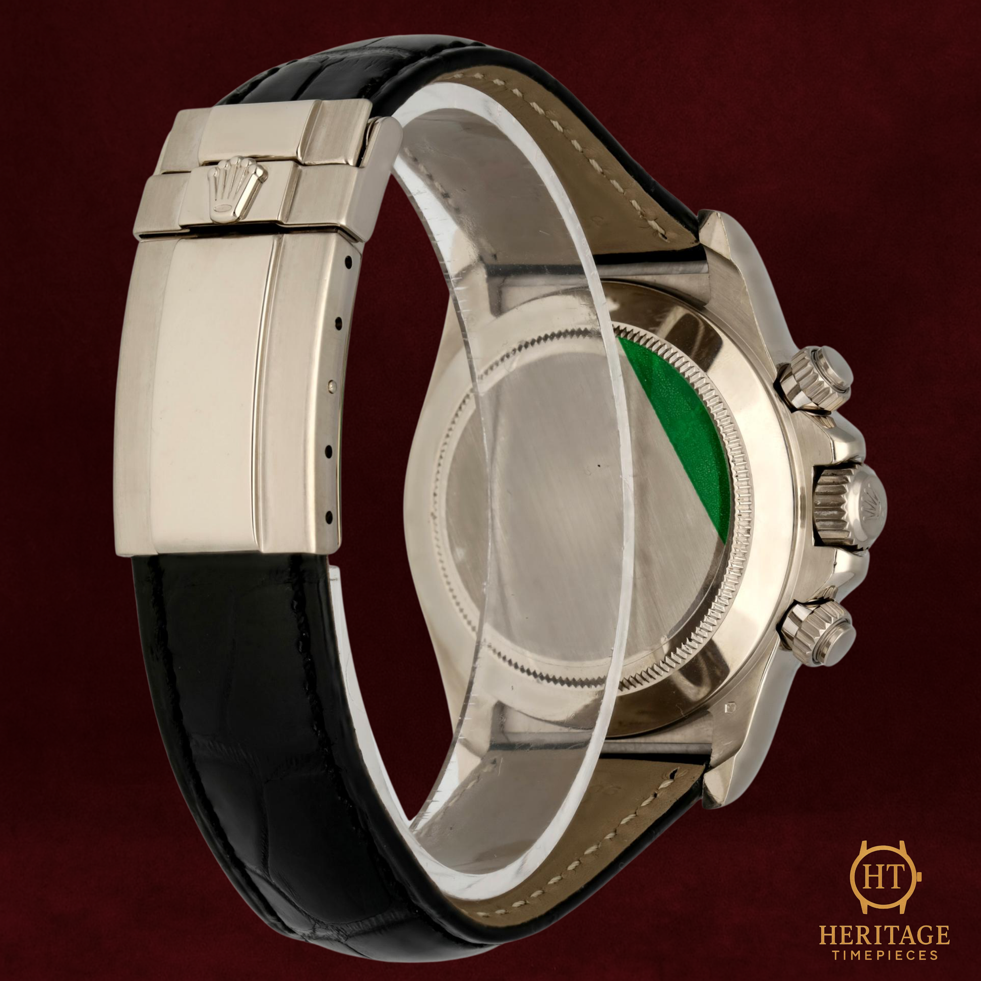 This example, crafted in 18k white gold, features a black dial with factory-set diamond hour markers, combining subtle opulence with unmistakable vintage character. The 40 mm case, smooth gold bezel, and black alligator strap create a timeless aesthetic that bridges the sporty origins of the Daytona with refined luxury.