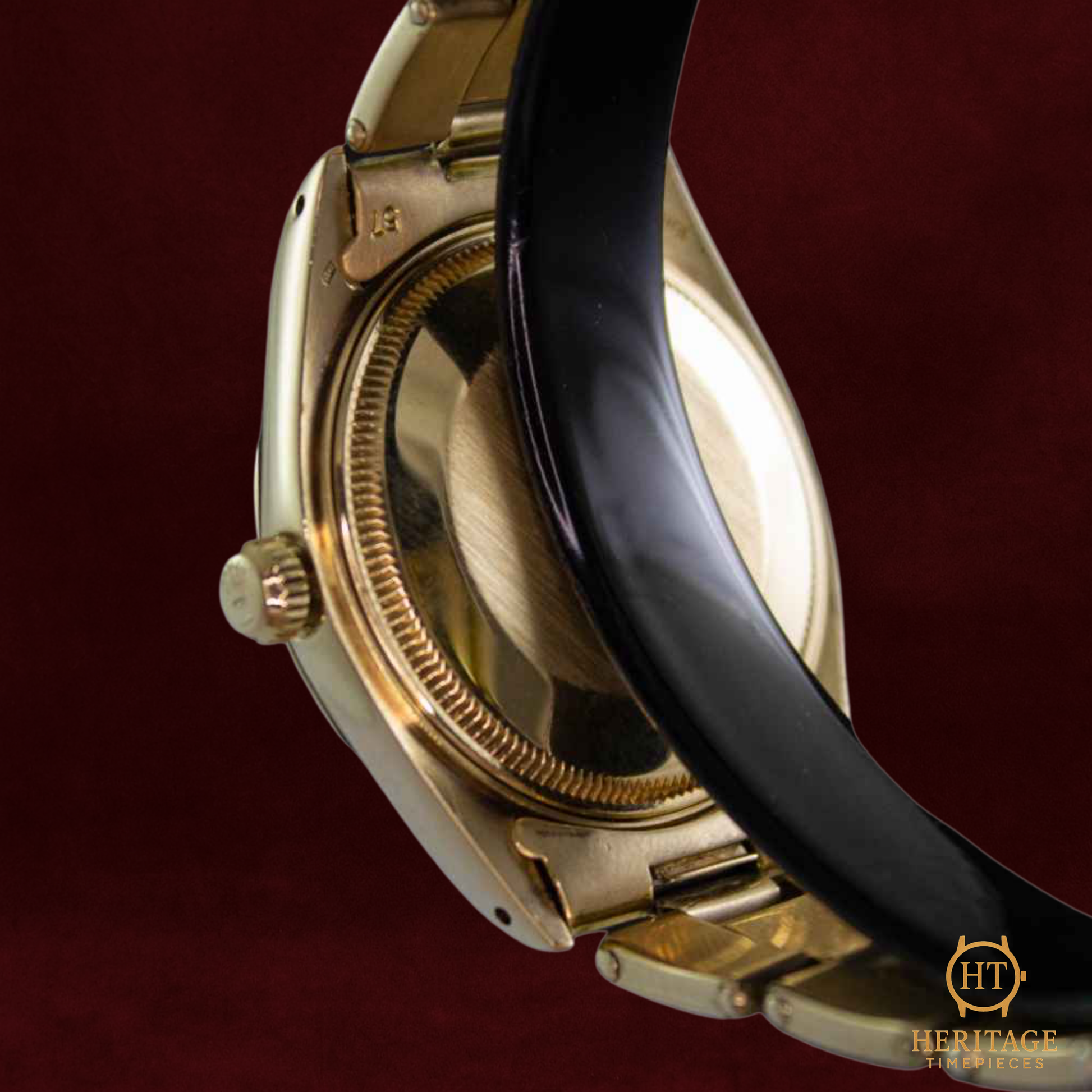 This 1977 example takes that formula into a more luxurious realm, crafted entirely from 18k yellow gold. The 34 mm Oyster case pairs perfectly with the warm golden sunburst dial, creating a cohesive aesthetic that reflects light with subtle depth. The plexiglass crystal adds a soft vintage charm that later sapphire-equipped models lack, giving this piece the unmistakable character of pre-1980s Rolex craftsmanship.
