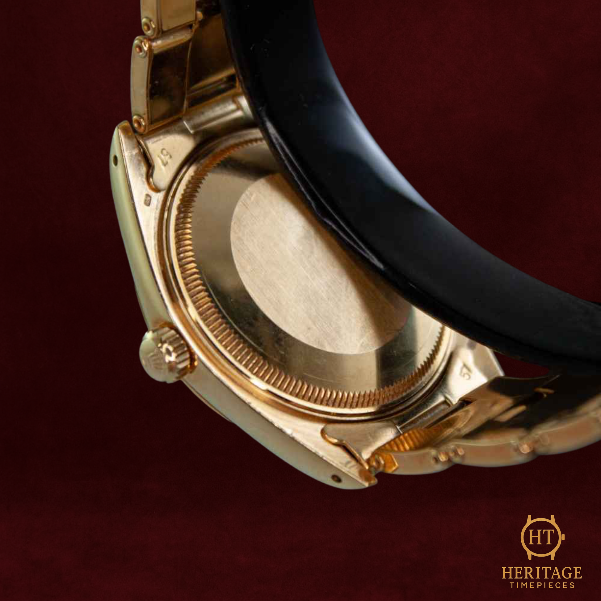 This 1978 example is executed entirely in 18k yellow gold, a configuration that elevates the simplicity of the model into something quietly luxurious. The 34 mm Oyster case reflects classic Rolex proportions of the era, while the gold dial creates a cohesive, monochromatic aesthetic that feels both warm and timeless. The absence of unnecessary complications allows the design to remain clean, legible, and balanced.