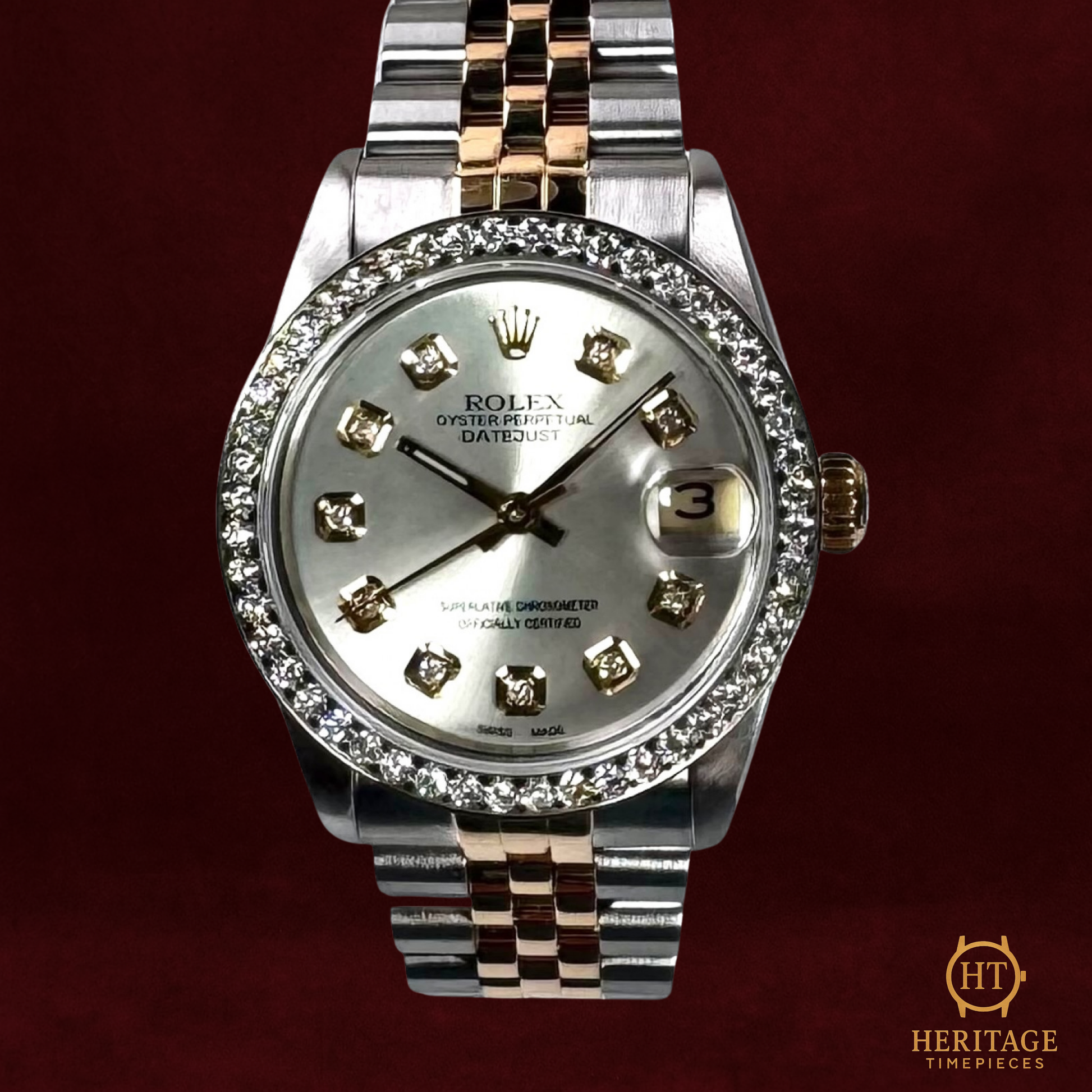 Silver dial with diamond hour markers (custom), gold hands