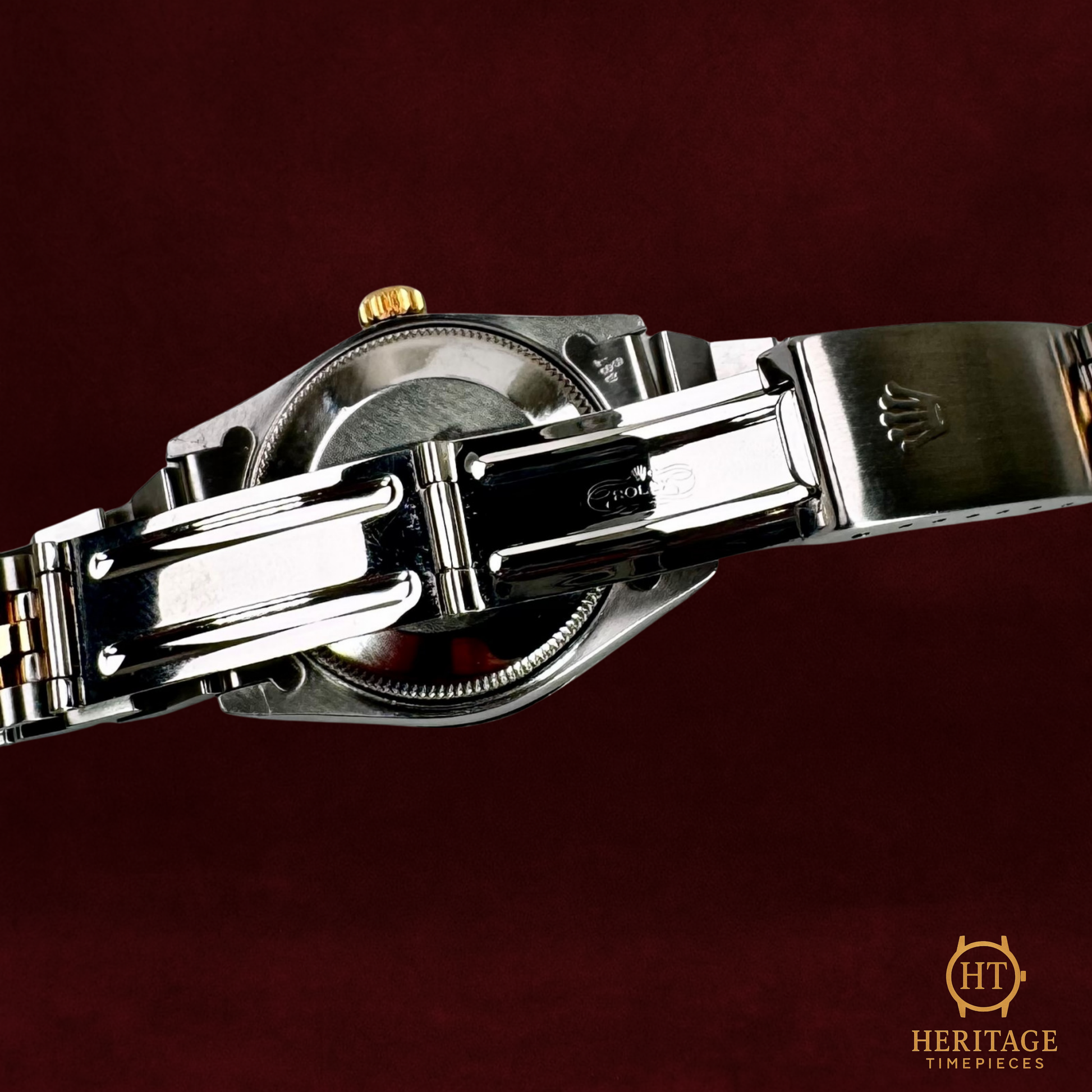 The reference 68273 represents the slightly larger 31 mm Datejust, a size that bridges classic ladies’ proportions with a more contemporary wrist presence. Crafted in Rolesor stainless steel and yellow gold, it combines durability with unmistakable Rolex elegance. This example elevates the design further with a custom diamond-set white gold bezel and a silver dial featuring diamond hour markers, adding brilliance without overwhelming the original architecture of the watch.