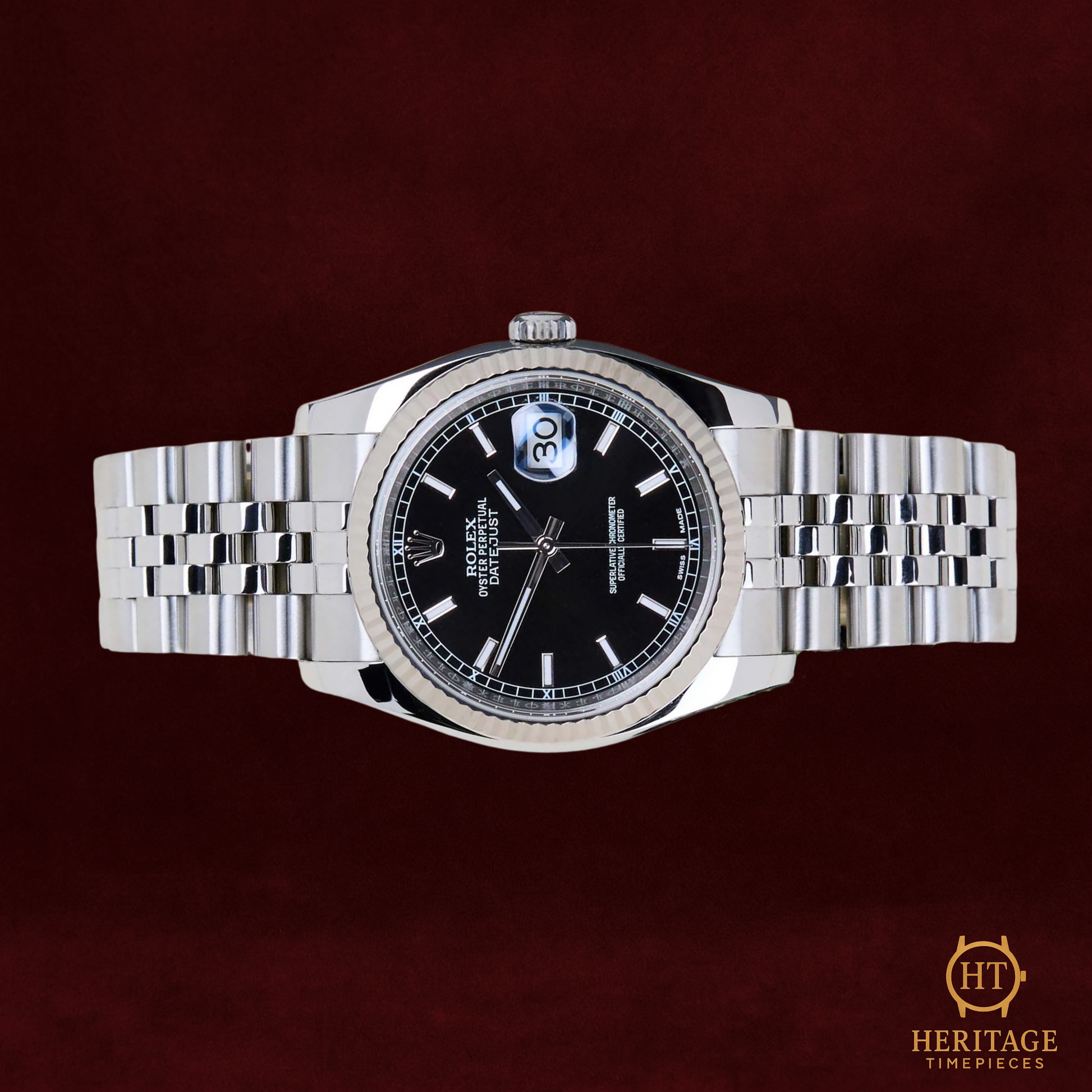The Rolex Datejust has been a cornerstone of the brand since its launch in 1945, combining timeless design with everyday practicality. The reference 116234, produced from the mid-2000s until the late 2010s, represents one of the most refined modern versions of the 36 mm Datejust. Distinguished by its fluted bezel in 18k white gold, paired with an Oystersteel case and bracelet, it balances subtle luxury with durability.