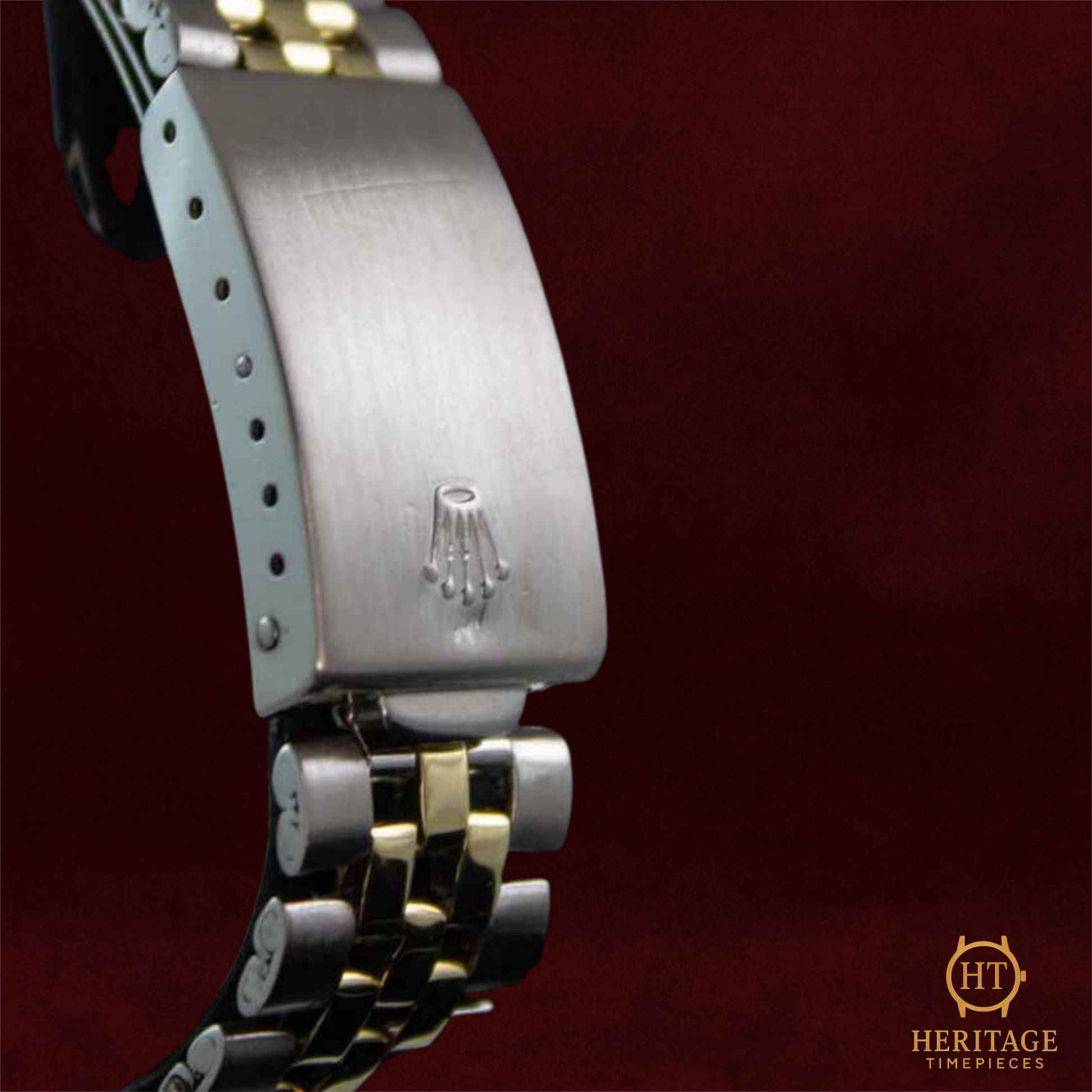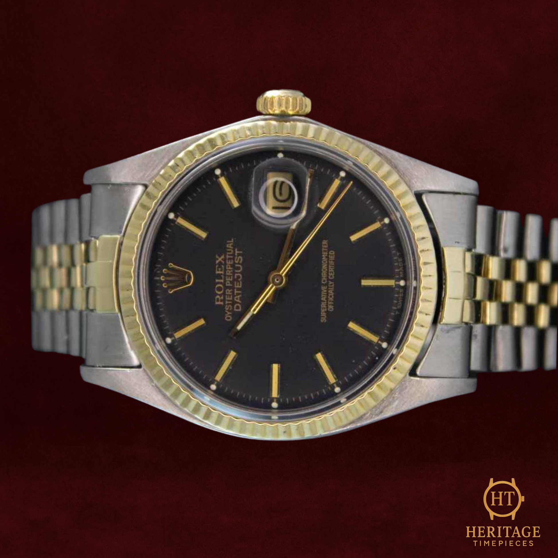The watch features a 36 mm stainless steel Oyster case paired with an 18k yellow gold fluted bezel, forming the signature Rolesor combination that has come to represent the Datejust line. The black dial — a particularly sought-after configuration from this era — offers striking contrast against the gold hour markers and hands, framed under a plexiglass crystal that adds vintage warmth.