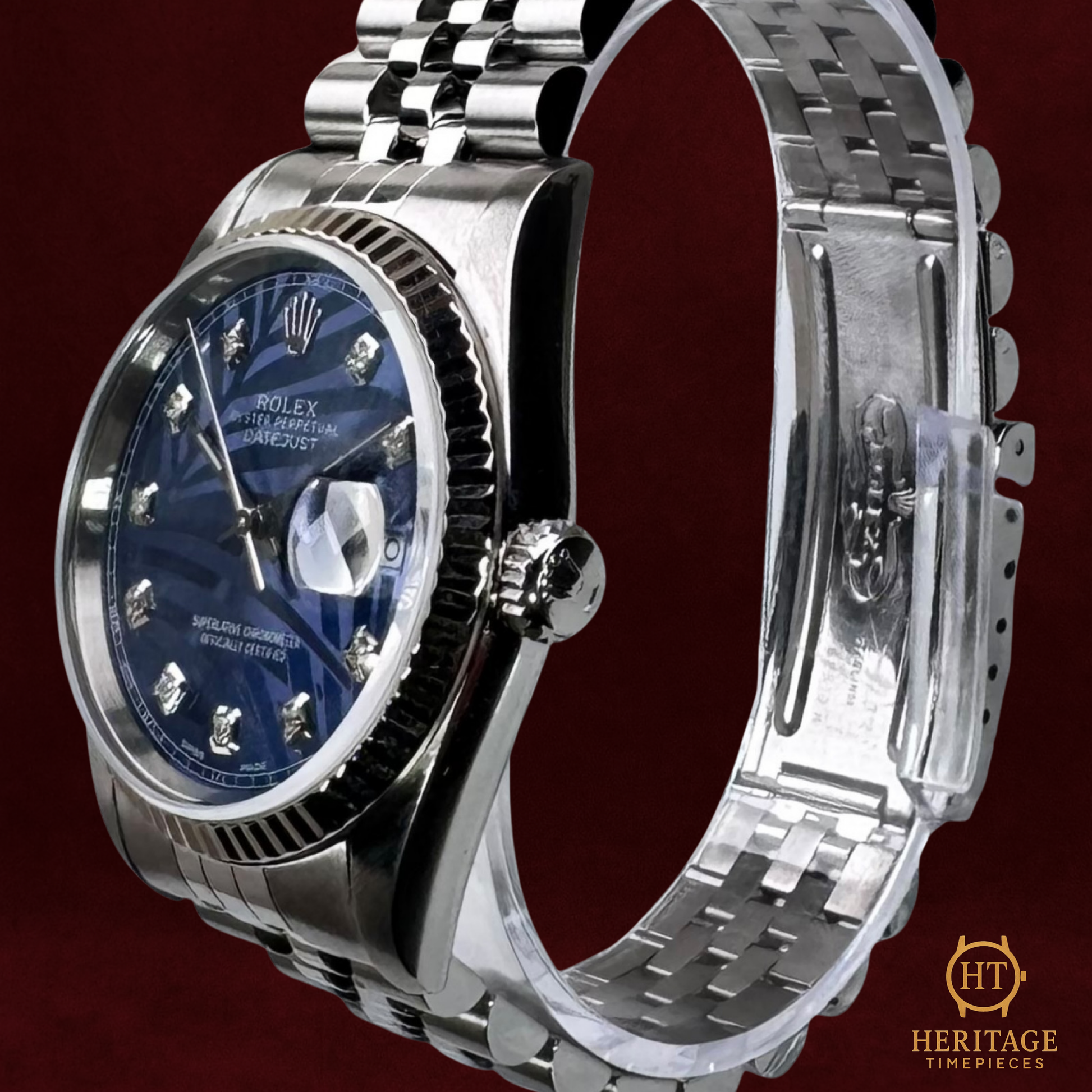 Crafted in stainless steel and paired with an 18k white gold fluted bezel, the reference strikes a perfect balance between durability and refinement. This example features a blue motif dial, elevated further by diamond hour markers added at a later stage. While the diamonds are custom-set and not factory original, they give the watch a distinctive presence without overpowering the classic Datejust character.