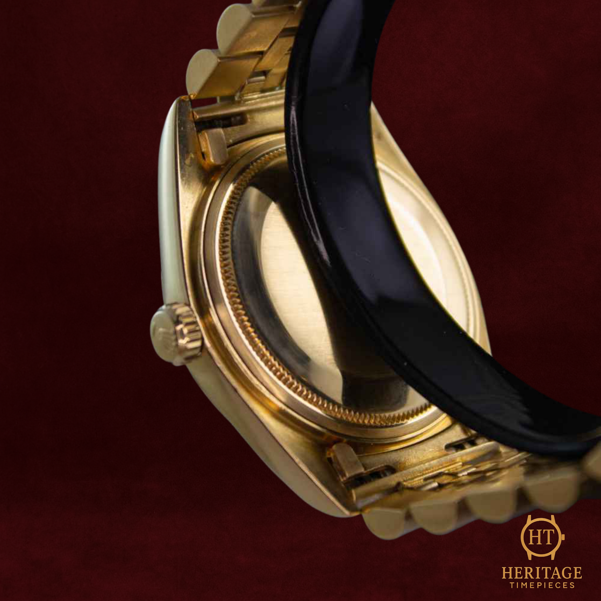 This 1979 example is crafted entirely in 18k yellow gold, exuding warmth and sophistication in equal measure. Its 36 mm Oyster case is paired with a fluted bezel and a champagne sunburst dial, highlighted by gold baton hour markers and hands that reflect light with subtle brilliance. The iconic President bracelet completes the look, offering both comfort and unmistakable presence.