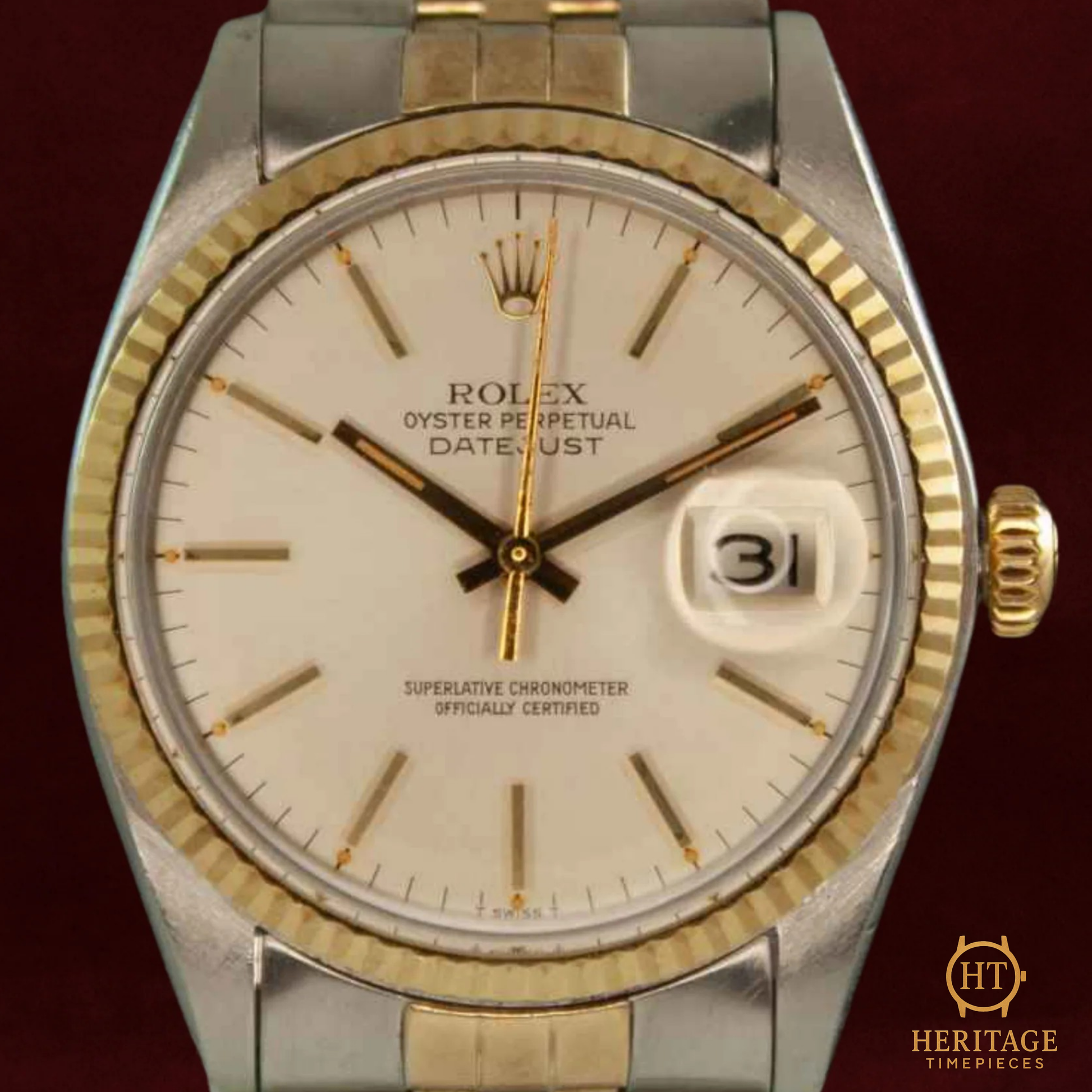 This reference 16013, produced in 1978, represents one of the most beloved configurations of the late 20th century: the classic two-tone steel and yellow gold combination. The silver sunburst dial captures light beautifully, while the fluted gold bezel adds depth and character. The acrylic (plexiglass) crystal gives this vintage model its period-correct warmth and subtle distortion that collectors prize.