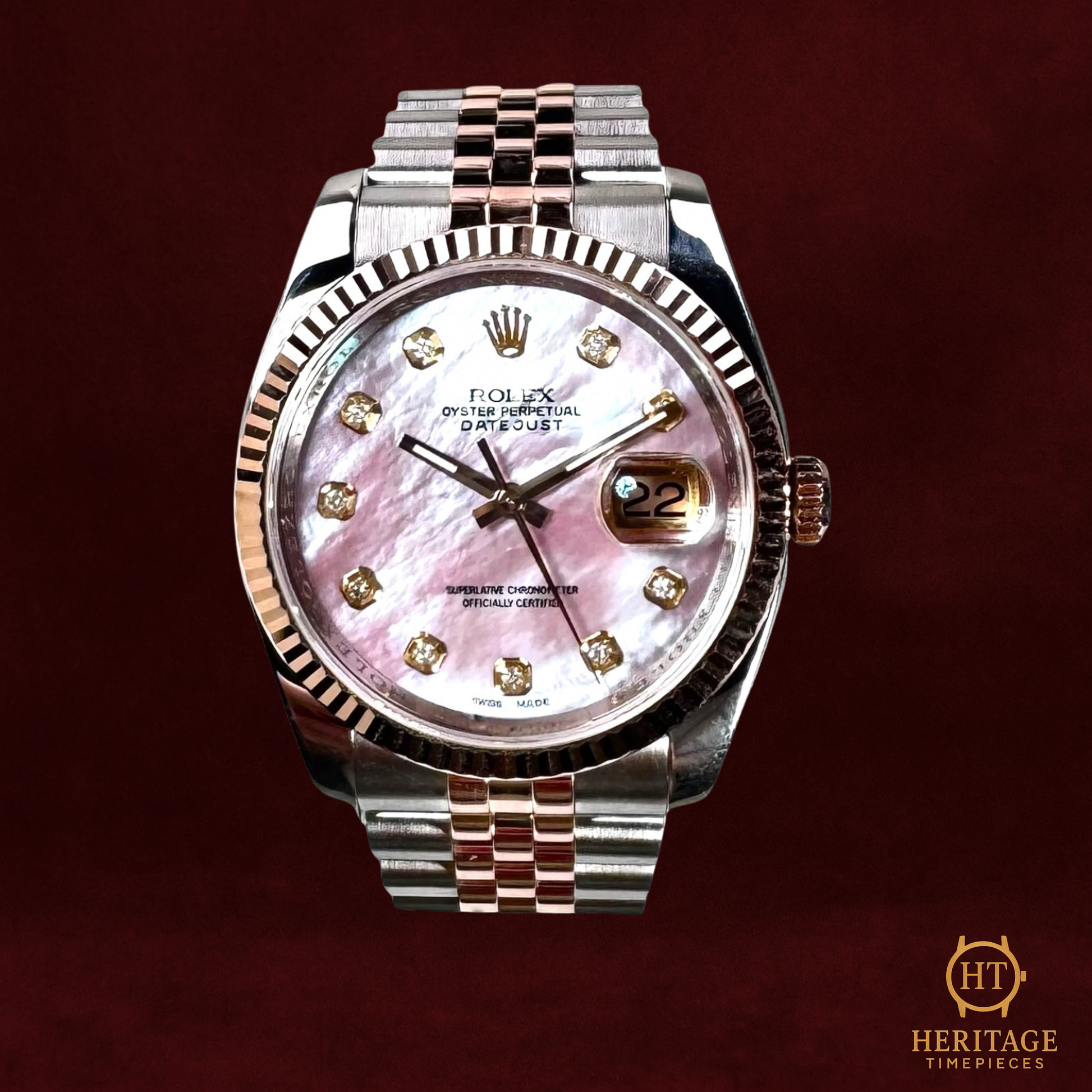 This 2010 example, serial G63XXXX, features a 36 mm Oyster case with a fluted rose gold bezel and a Jubilee bracelet that reinforces its classic identity. What sets this particular piece apart is its custom rose mother-of-pearl dial, beautifully accented by diamond hour markers — a lavish reinterpretation that gives the watch an unmistakable presence. Powered by the Rolex calibre 3135, it combines everyday reliability with undeniable elegance. Offered in mint condition with box and booklet, it is a distinctive, jewel-like take on the modern Datejust.
