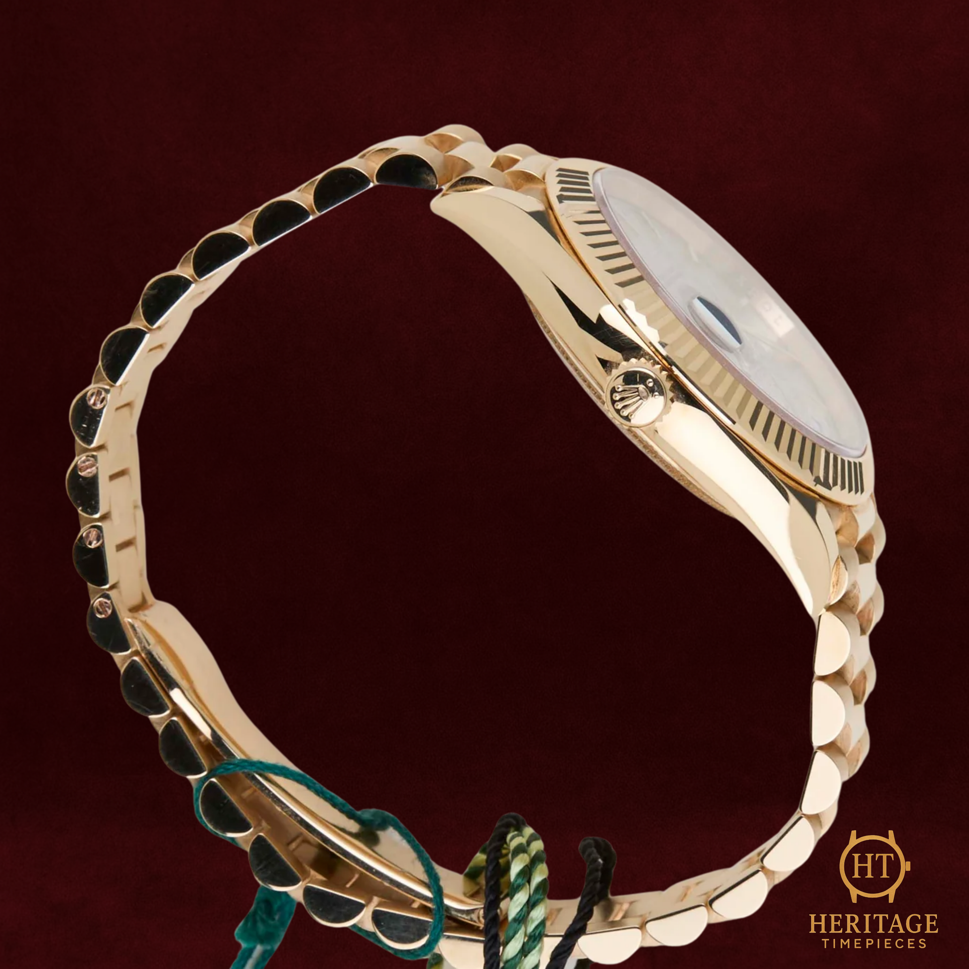 This 2022 example, reference 228238, embodies classic luxury with its solid 18k yellow gold case and President bracelet, paired with a striking silver dial featuring Rolex’s diagonal motif pattern. The geometric texture adds a subtle layer of modernity to the timeless design, while the fluted bezel and polished surfaces reflect light with characteristic brilliance. Inside beats the Calibre 3255, a next-generation movement offering improved accuracy, durability, and a 70-hour power reserve. Offered in mint condition with its full set and covered by an international Rolex warranty until April 2027, this Day-Date 40 captures the essence of Rolex excellence — contemporary precision with timeless presence.
