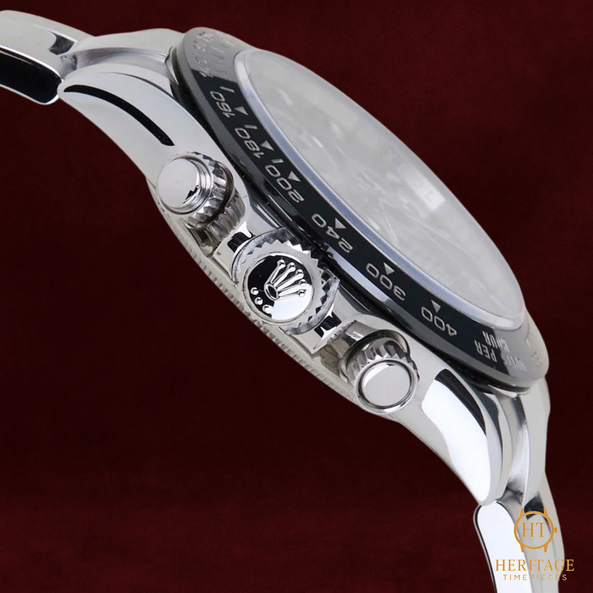 The Rolex Cosmograph Daytona 116500LN is one of the most sought-after modern sports watches ever produced. Introduced in 2016 and powered by Rolex’s in-house calibre 4130, the reference marked the arrival of the first steel Daytona with a black Cerachrom bezel — instantly redefining the model’s modern silhouette and accelerating its status deep into collector mania.