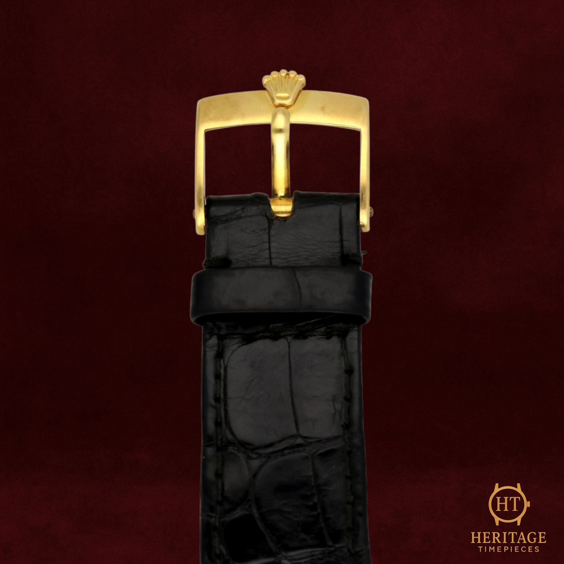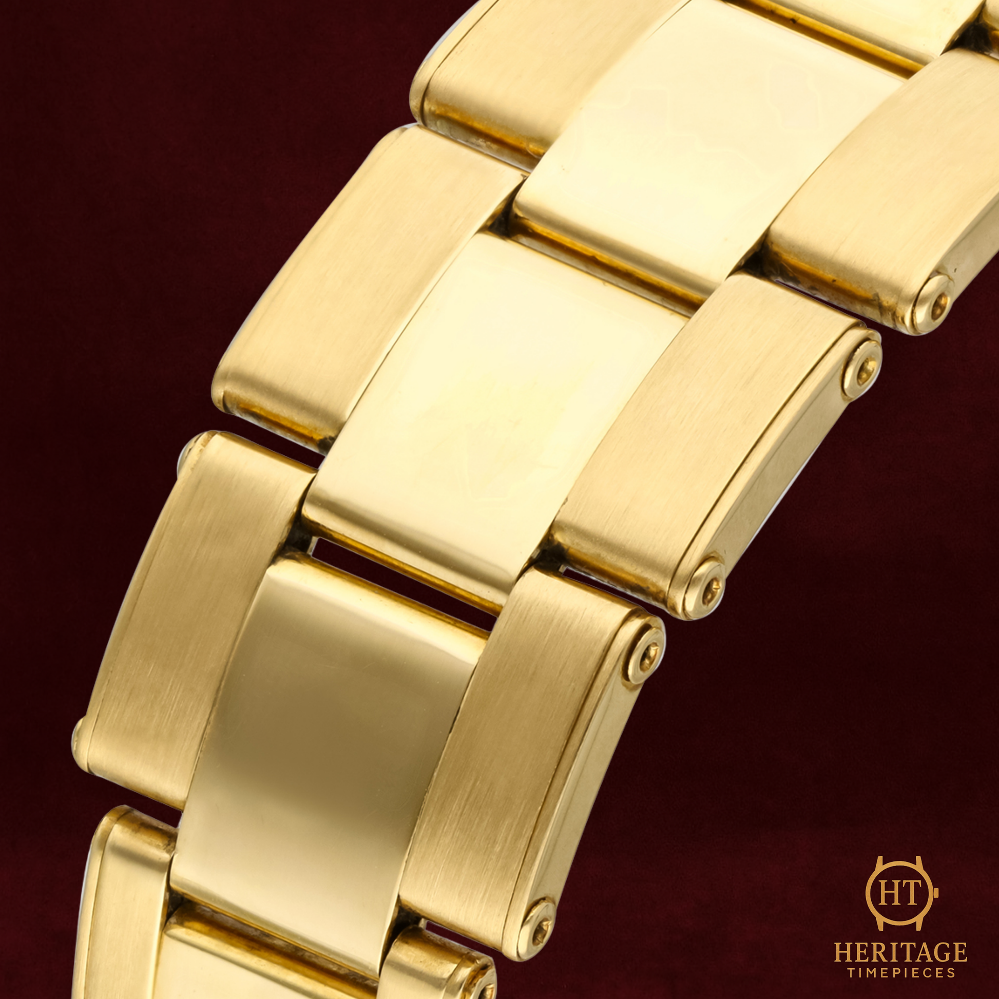 Crafted entirely from 18k yellow gold, this 1986 example represents one of the rarest and most desirable configurations of the 6265—distinguished by its screw-down pushers, solid gold tachymeter bezel, and the classic plexiglass crystal. The champagne-gold dial radiates a warm, unmistakably vintage charm, complemented by contrasting black sub-registers and crisp printing.