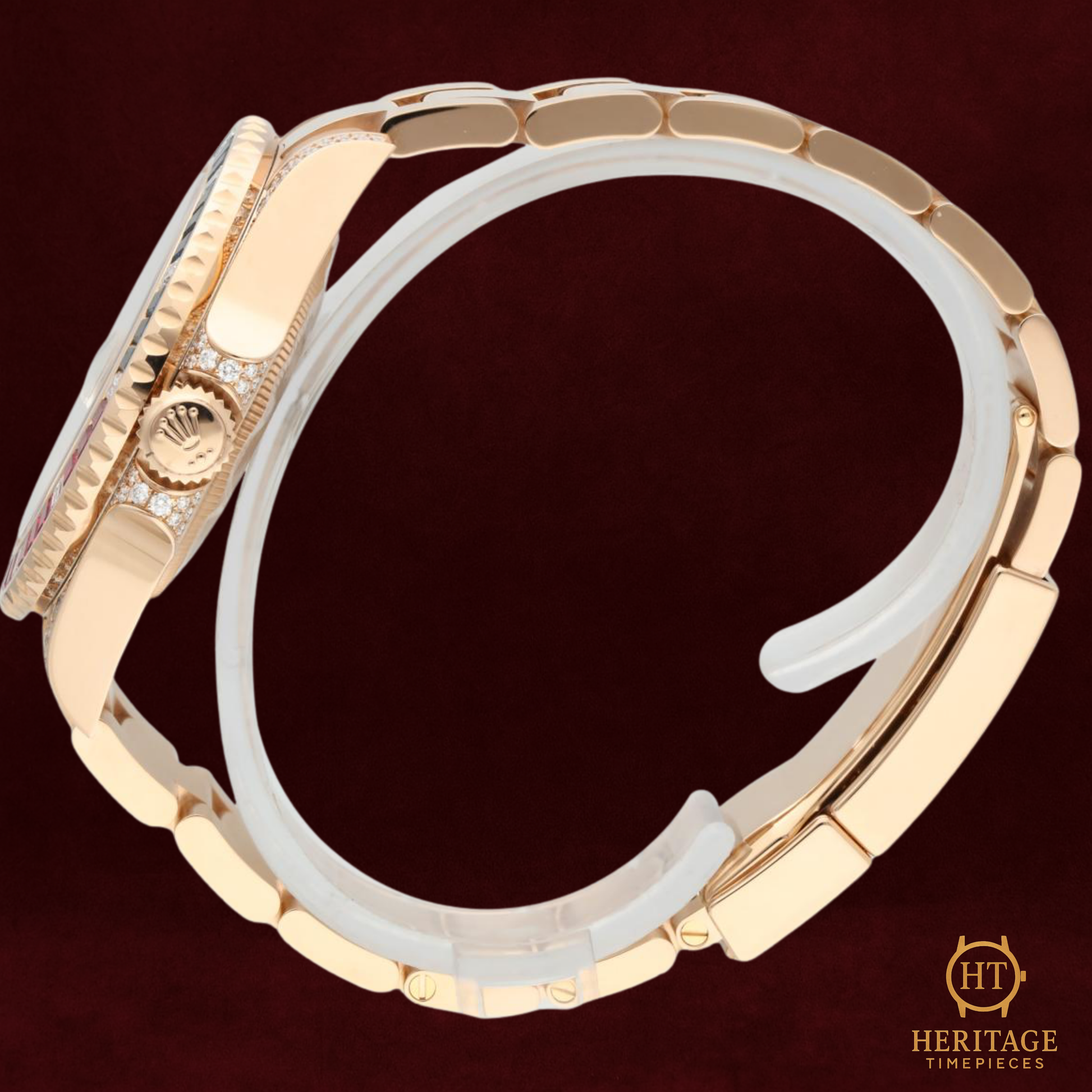 The reference 126755SARU elevates this legend to exceptional levels of opulence. Crafted entirely in 18 k Everose gold, it features a bezel invisibly set with baguette-cut sapphires, rubies, and diamonds arranged in Rolex’s signature red-and-blue “SARU” pattern. The lugs and crown guards are likewise set with factory diamonds, reflecting light with remarkable brilliance while preserving the model’s professional DNA.