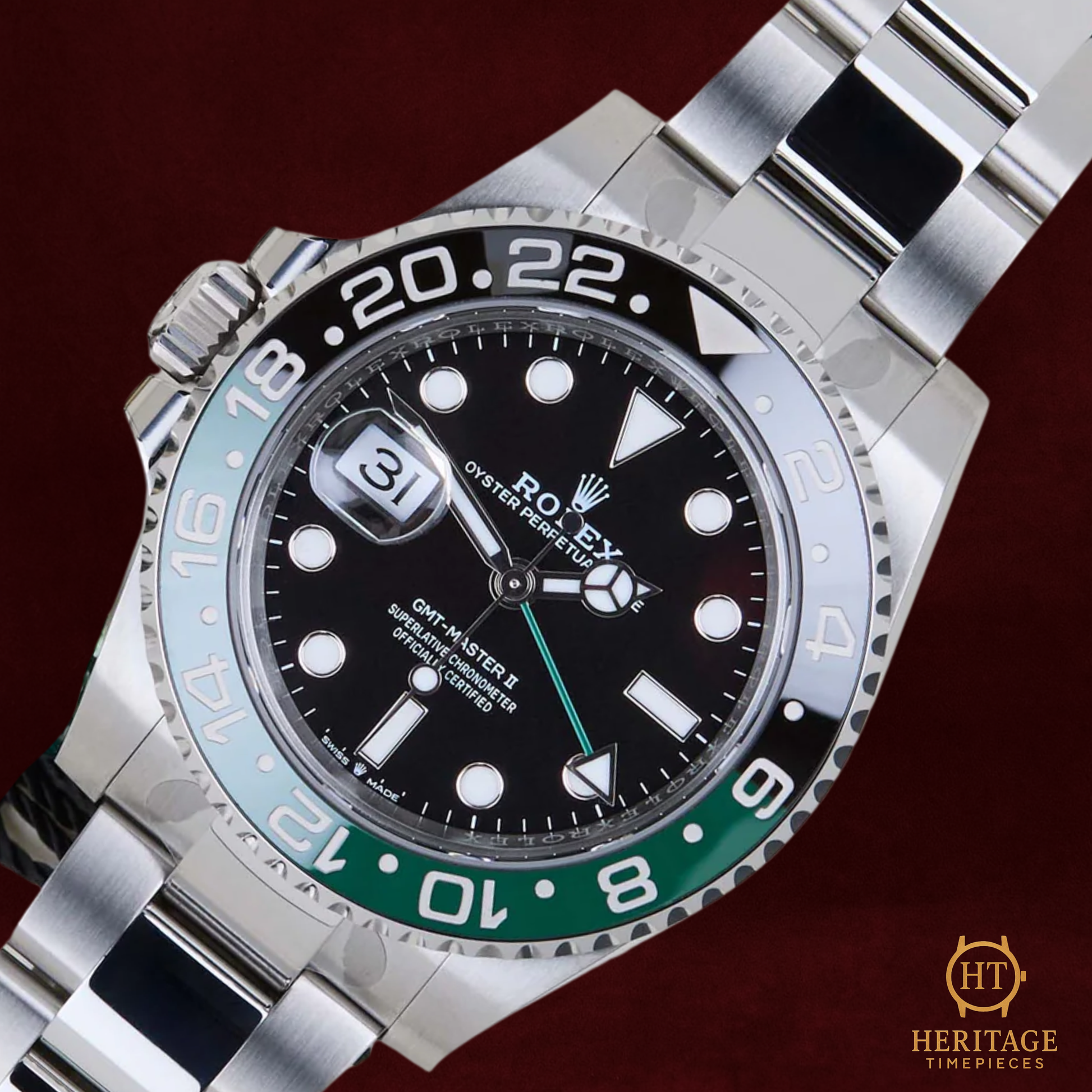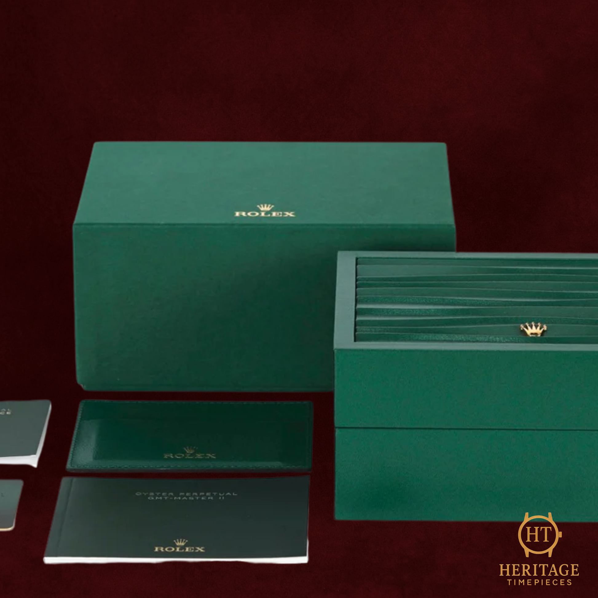 This September 2025 example is presented in unworn condition, partly stickered, and showcases the instantly recognizable green and black Cerachrom bezel that quickly earned the nickname “Sprite.” The 40 mm stainless steel Oyster case is paired with a black dial and luminous Chromalight display, ensuring optimal legibility across time zones. At its heart beats the Rolex Calibre 3285, offering exceptional efficiency, precision, and a 70-hour power reserve.