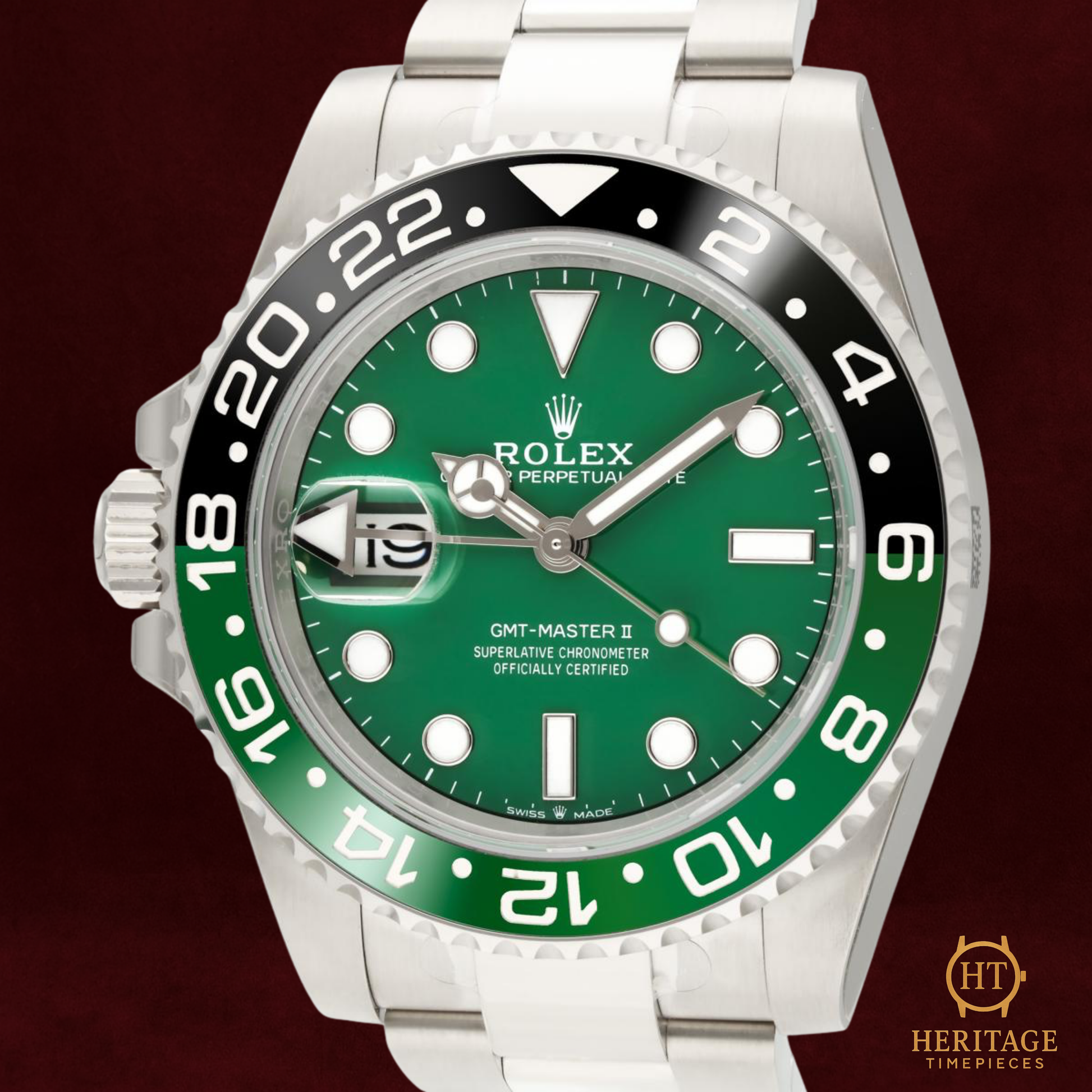 The combination of a white-gold Oyster case, bi-color green and black ceramic bezel, and a rich green dial creates a visual profile unlike any other GMT-Master II. The watch preserves all the core features of the model—dual-time functionality, a robust automatic calibre, and 100 m water resistance—while delivering a contemporary expression that collectors immediately recognized as highly distinctive. As a 2025 full-set example in brand-new condition, this 126729VTNR embodies the cutting-edge of Rolex’s modern design language and precious-metal craftsmanship.