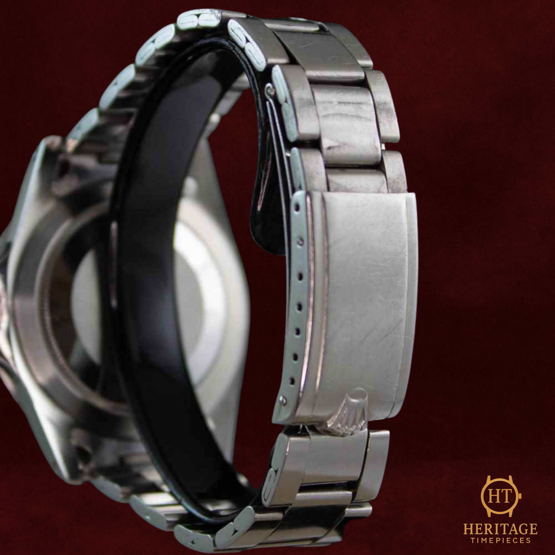 This 1968 example sits firmly within the transitional gilt-style era, showcasing the rich black matte dial, tritium lume plots, and warm plexiglass crystal that give the late-60s GMT-Masters their iconic depth and charm. The 40 mm stainless-steel Oyster case delivers the durability expected from a watch designed for international pilots, while the red GMT hand and bi-directional bezel make the model as functional now as it was over 50 years ago.