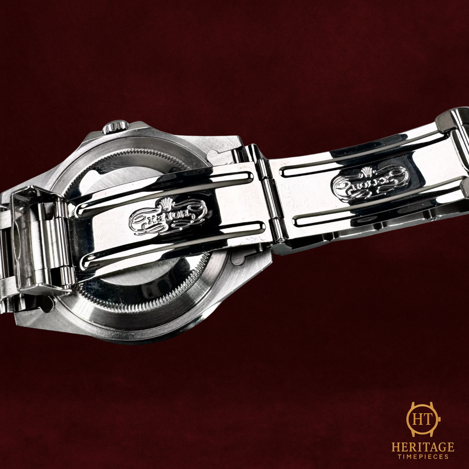 This A-serial (1999) example features a 40 mm stainless steel Oyster case with a red and blue aluminum bezel insert, giving it the unmistakable “Pepsi” aesthetic that has become synonymous with the model. The black glossy dial with luminous hour plots framed in white gold adds crisp legibility and timeless appeal. Powered by the Calibre 3175, it offers automatic winding, a quickset date, and the ability to track up to three time zones via the 24-hour hand. Offered in mint condition, complete with box, Rolex certificate, and booklets, this piece is a pristine example of one of the most historically significant GMT references.