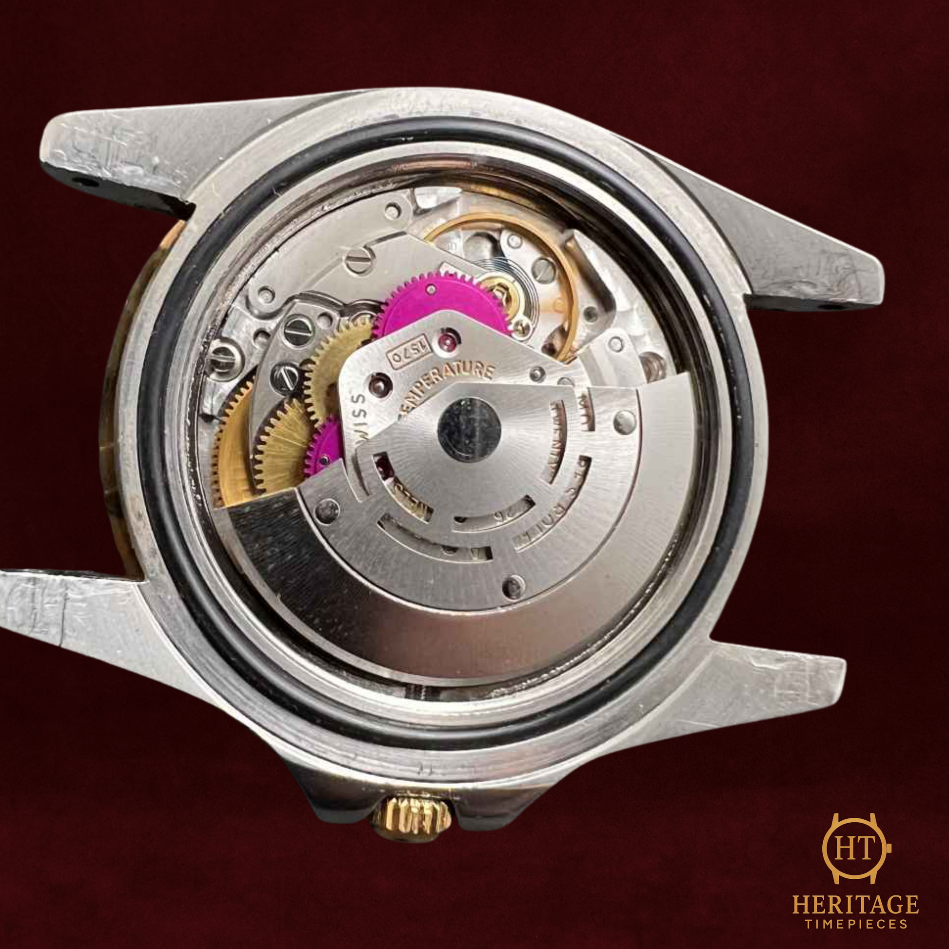 This 1970 example represents the coveted “Root Beer” configuration, featuring a tropical brown dial with gilt details and a two-tone steel and yellow gold case. The combination of warm metallic tones and aged patina gives this piece a unique vintage charm, while the bi-directional 24-hour bezel retains the model’s original functionality for tracking multiple time zones.
