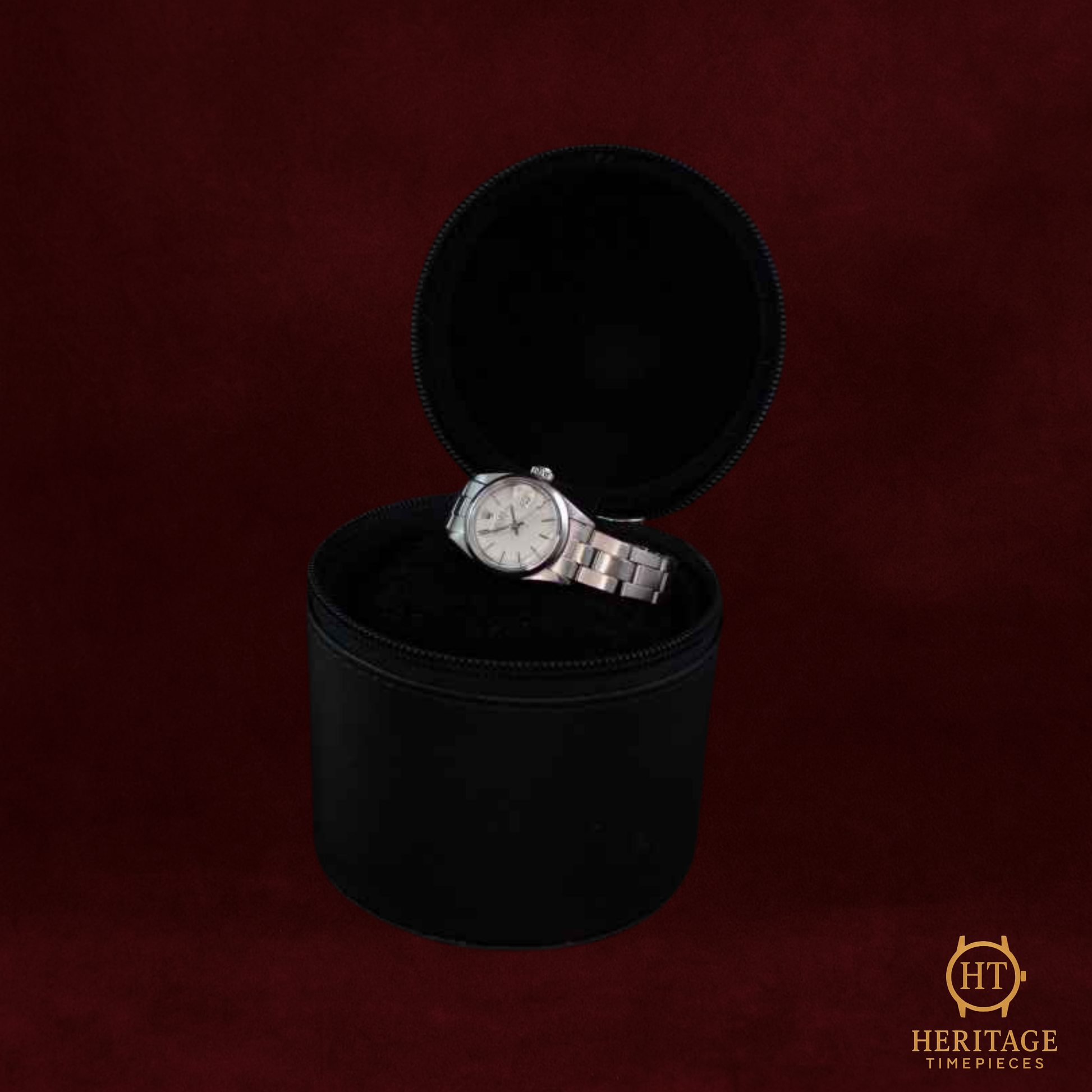 This 1972 example is a true vintage classic, featuring a 26 mm stainless steel Oyster case paired with a crisp white dialunder a plexiglass crystal, delivering that unmistakable vintage warmth collectors appreciate. Its balanced proportions and minimalist design make it a versatile piece, equally suited for everyday wear or formal occasions.