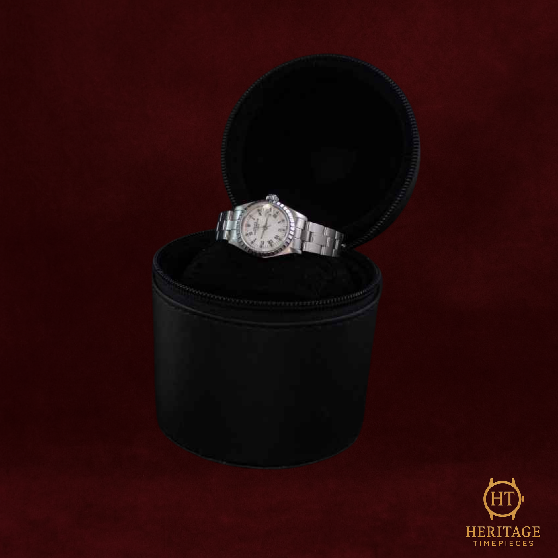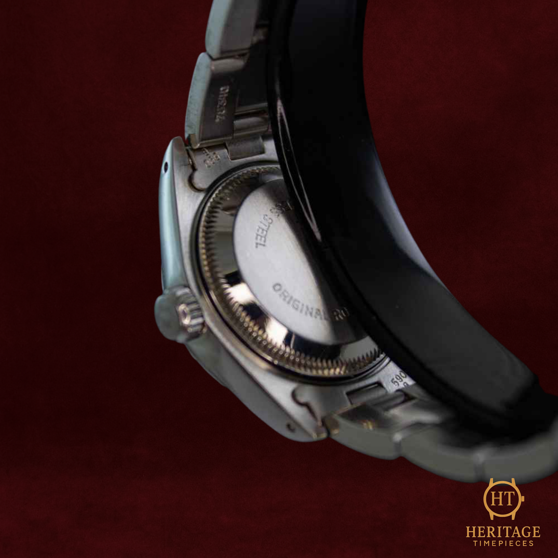 This 1988 example features a 26 mm stainless steel Oyster case paired with a matching Oyster bracelet and a timeless white dial adorned with baton hour markers. At its heart beats the Rolex Calibre 2135, a chronometer-certified automatic movement renowned for its accuracy and reliability. The watch’s understated monochrome palette and robust construction make it both refined and durable — a quintessential everyday Rolex for women of taste.