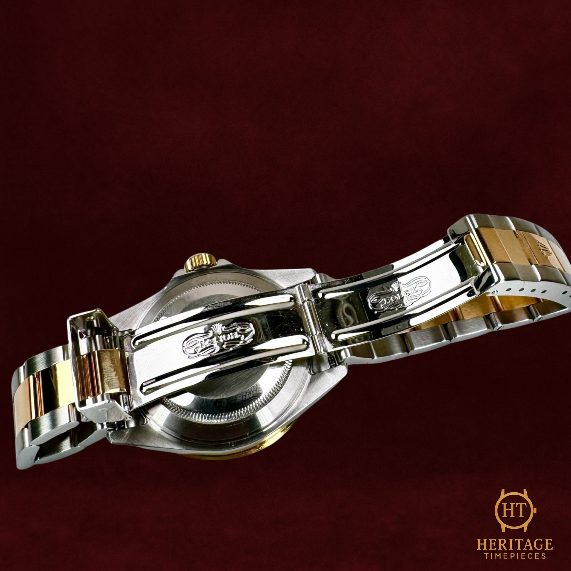 This Z-serial example from 2007 represents the very last generation of the 16613 before the transition to the ceramic-bezel models. The 40 mm stainless steel Oyster case is accented by an 18k yellow gold bezel and vibrant blue aluminum insert, surrounding a sunburst blue dial with gold-trimmed luminous hour markers. Its combination of deep ocean hues and precious metal warmth creates an instantly recognizable look — timeless and unmistakably Rolex.