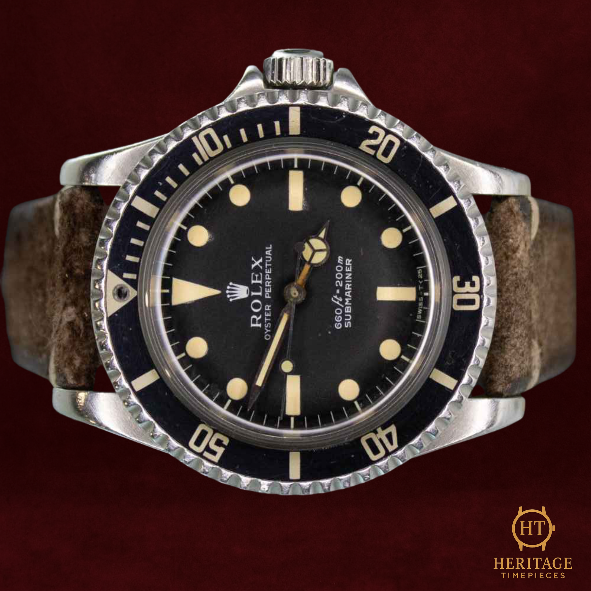 Vintage condition with honest wear consistent with a mid-1960s Submariner; later crystal and strap replacement